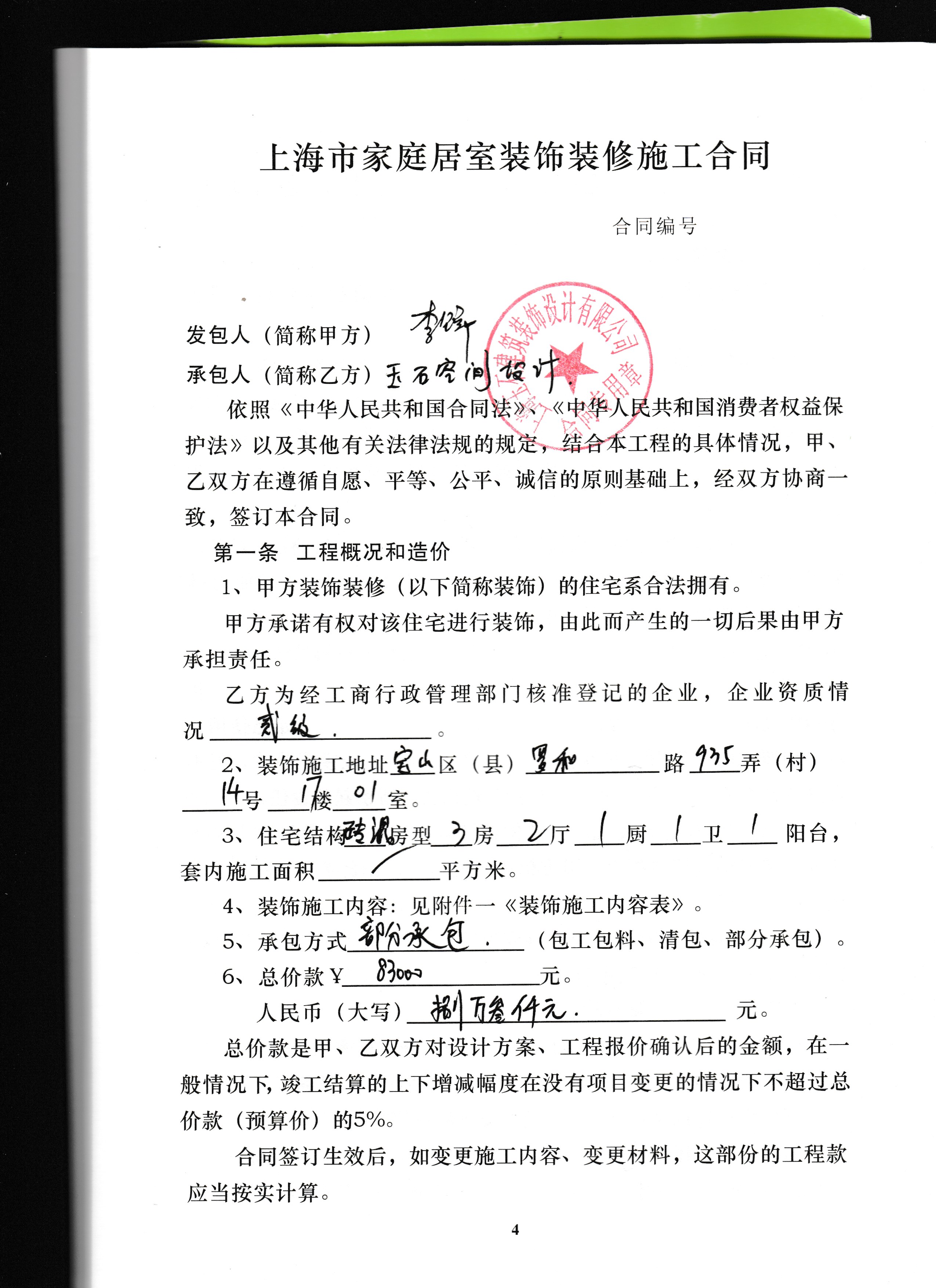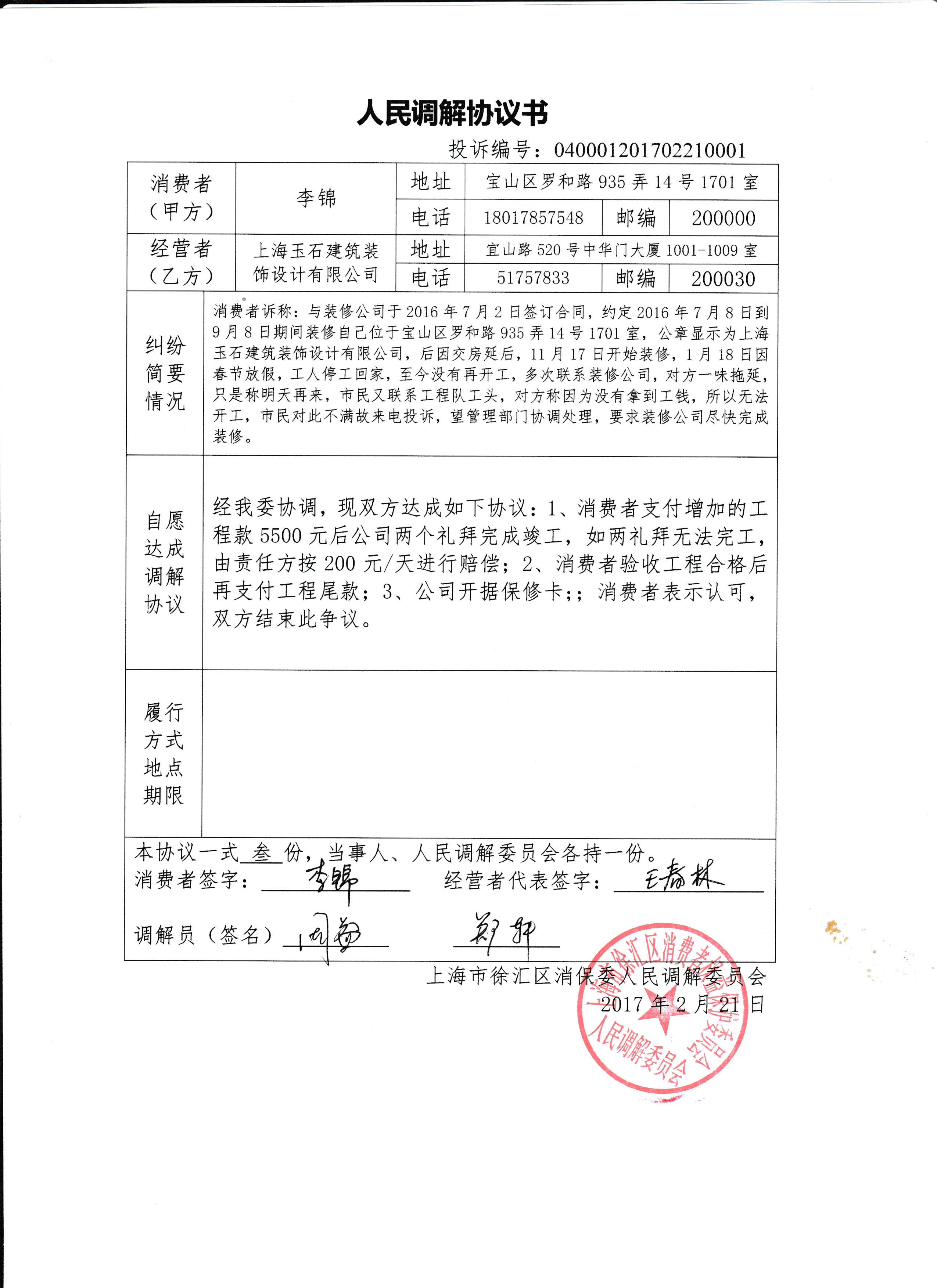 | 投訴類型 | 施工質(zhì)量 | 投訴人 | 李** | 被投訴單位 | 上海玉石建筑裝飾設計有限公司 |