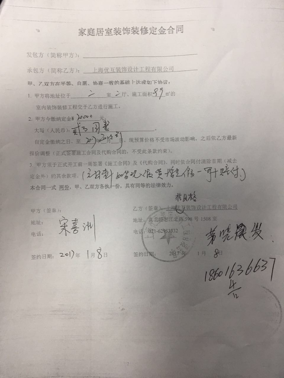 2016年12月份,接到一個(gè)電話,對(duì)方自稱是上海優(yōu)互裝飾設(shè)計(jì)工程有限公司的茅曉歲,問(wèn)本人是否有裝修需求,