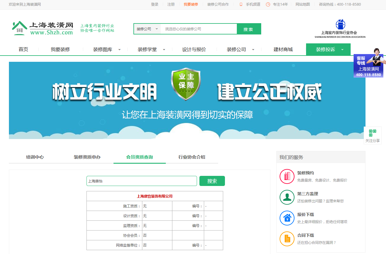 經(jīng)上海裝飾裝修行業(yè)協(xié)會(huì)查實(shí),唐怡裝飾沒(méi)有任何裝修資質(zhì)(見(jiàn)圖片),其行為嚴(yán)重欺騙了消費(fèi)者。
