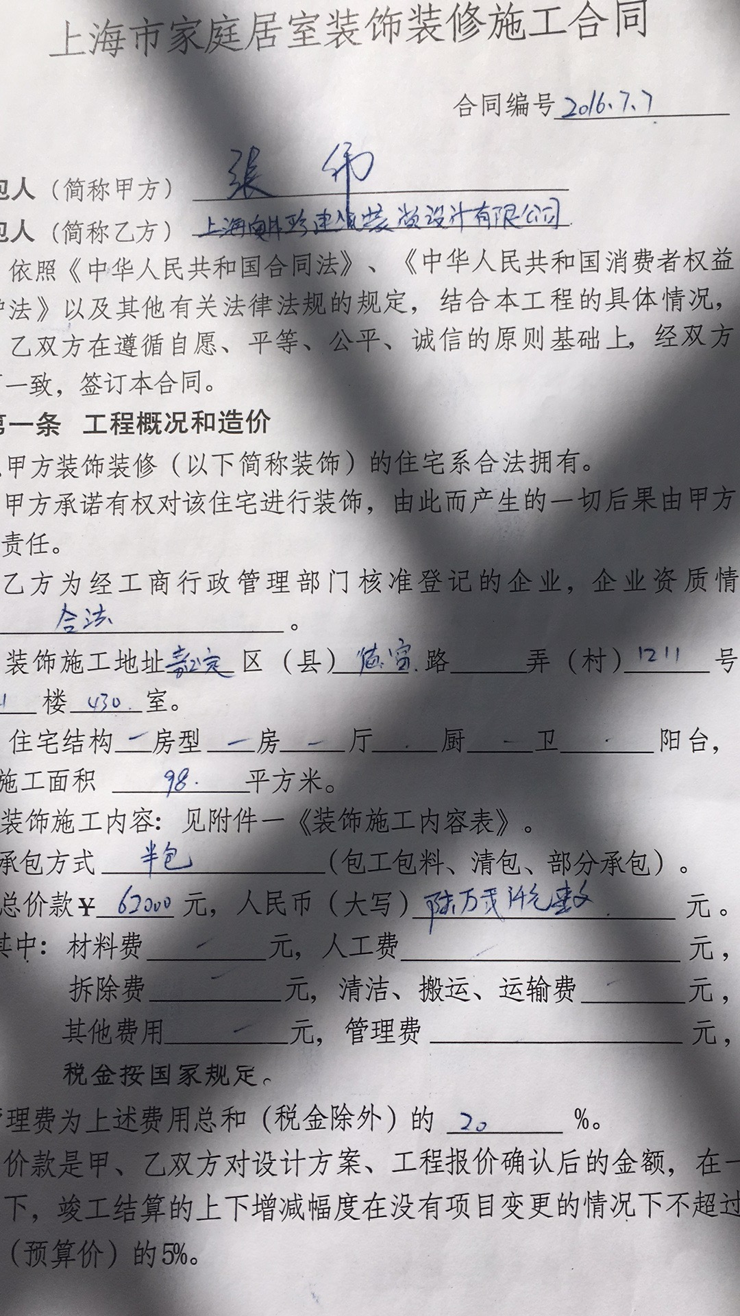 我母親于2015年12月購買此項目所在房,后經(jīng)該房產(chǎn)公司銷售經(jīng)理王俊介紹,與2016年與該公司簽訂裝修合同,合同大致內(nèi)容是除家電、床、部分家具已經(jīng)燈以外全包,裝修總金額是62000元。裝修期限是2016年7月8日至2016年9月8日。并且我方已與8月之前繳納清前期的5萬元費(fèi)用,并將已購買好的空調(diào)油煙機(jī)以及熱水器尺寸報給該公司老板。但是施工方在做完前期的水電已經(jīng)剛架構(gòu)的隔層以后就停工,我于9月8號至11月底兩個月內(nèi)多次去驗收房屋,工程均未有任何進(jìn)展(地磚地板未鋪,衛(wèi)生間未動工),后在我屢次催促之下。與年底之前勉強(qiáng)將這些工程完工。但是工程質(zhì)量十分粗糙,用料簡陋,參照照片,家電安裝處未按照我所給的尺寸預(yù)留,并造成家電無法安裝,之后為了敷衍,采取了一些簡易的方法補(bǔ)救。閣樓小房間空調(diào)下水管未預(yù)留,并對我稱已經(jīng)弄成這樣了不好再返工,空調(diào)下水的話弄個水桶接一下,滿了自己提出去倒了這種意見。再之后又沒了動靜,我屢次聯(lián)系對方,電話直接掛斷,偶爾在公司找到人,立刻稱自己在太倉等地還有工程要立刻過去或者上個廁所等一些劣質(zhì)的理由離開,然后再不出現(xiàn)。在之后至今又是長期聯(lián)系不到人,打電話根本不接聽,至今廚房的移門扔未安裝,該老板稱忘記了,現(xiàn)在我們通過一些特殊手段,堵在她家門口總算找到她,并向其提出讓其履行合同條款內(nèi)的違約賠償,該老板不與理會,甚至采取無賴手段找一些不相關(guān)的人哄我們走。本人家庭因為生活較為困難,老父親腦子開過刀之后就長期生活不能自理需要母親24小時陪護(hù),自己和愛人又要上班又要帶孩子,并且也不是特別懂得相關(guān)法律政策,無奈想貴機(jī)構(gòu)求助,希望能夠得到妥善的解決,再次表示衷心的感謝。