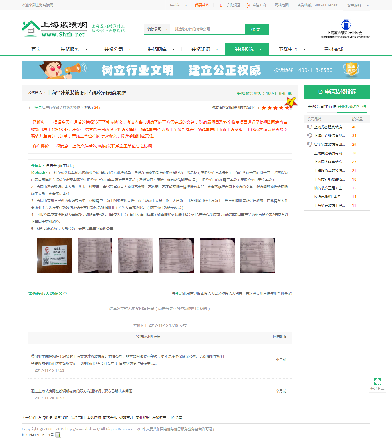 | 投訴類型 | 合同糾紛 | 投訴人 | 陳** | 被投訴單位 | 上海文龍建筑裝飾設(shè)計有限公司 |