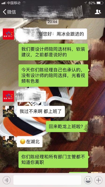 但是如果設(shè)計師確實離職了,那希望你們公司能給我對應的賠償方案。因為設(shè)計這種東西不是說誰來都行的,每個人理念不一樣,何況我出錢買的是周冰的設(shè)計和配搭。當時的陳經(jīng)理表示贊同,還說當晚9點之前給我滿意的答復,好了!事實證明又一次被忽悠,晚上又是我主動聯(lián)系群里各位領(lǐng)導層,最后直接用三年返來要挾我,說我違約~好~大家來評評理看看~
