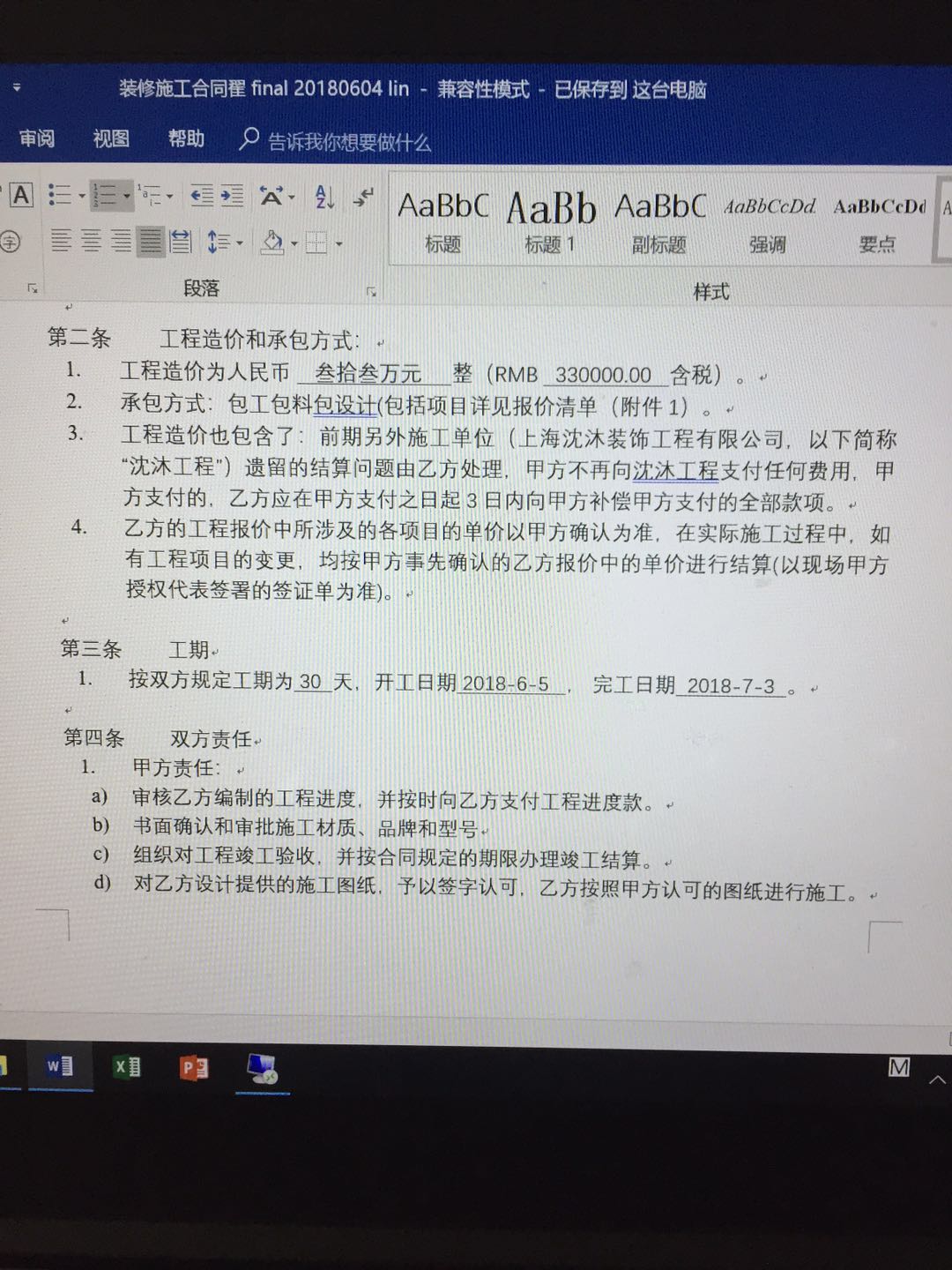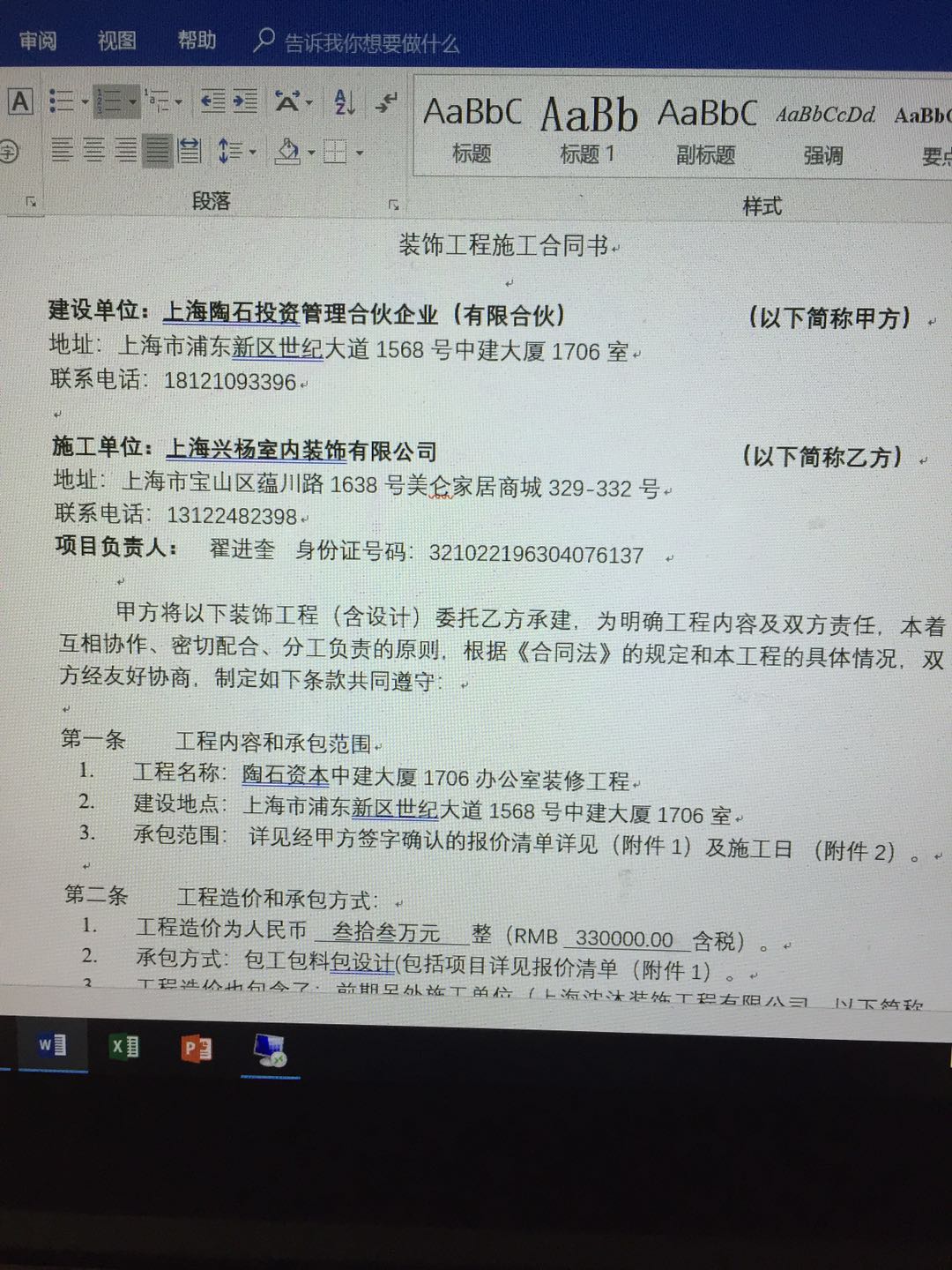 項(xiàng)目方施工名稱:上海興楊室內(nèi)裝飾有限公司,項(xiàng)目負(fù)責(zé)人:翟進(jìn)奎,聯(lián)系方式:13122482398,身份證號(hào):321022196304076137,合同于2018年6月4日簽署,工程造價(jià)33萬元人民幣(含稅),承包方式為:包工包料包設(shè)計(jì),于2018年6月25日補(bǔ)充簽署詳細(xì)報(bào)價(jià)清單,約定項(xiàng)目完工日期為2018年7月3日,截止目前工程尚未完工驗(yàn)收。施工方未提供設(shè)計(jì)服務(wù),且項(xiàng)目周期嚴(yán)重超期。