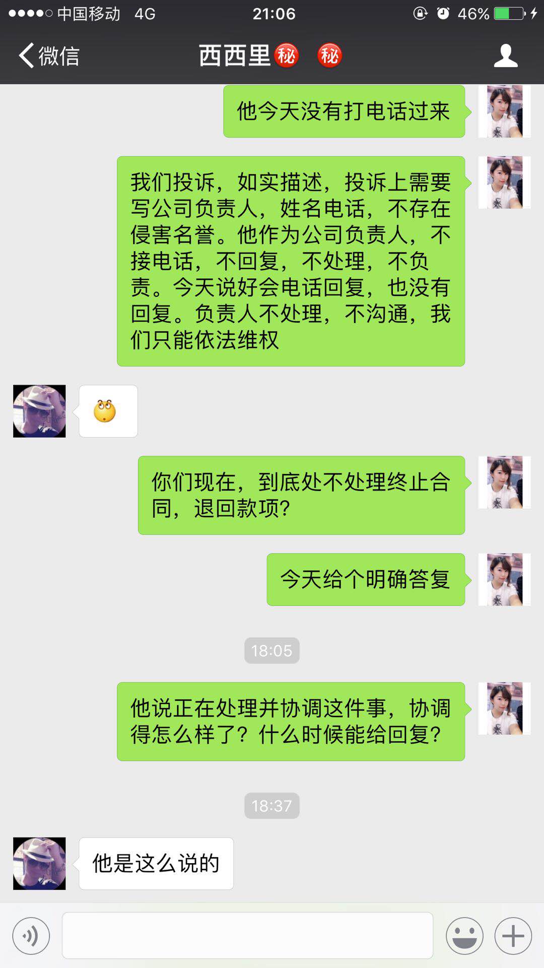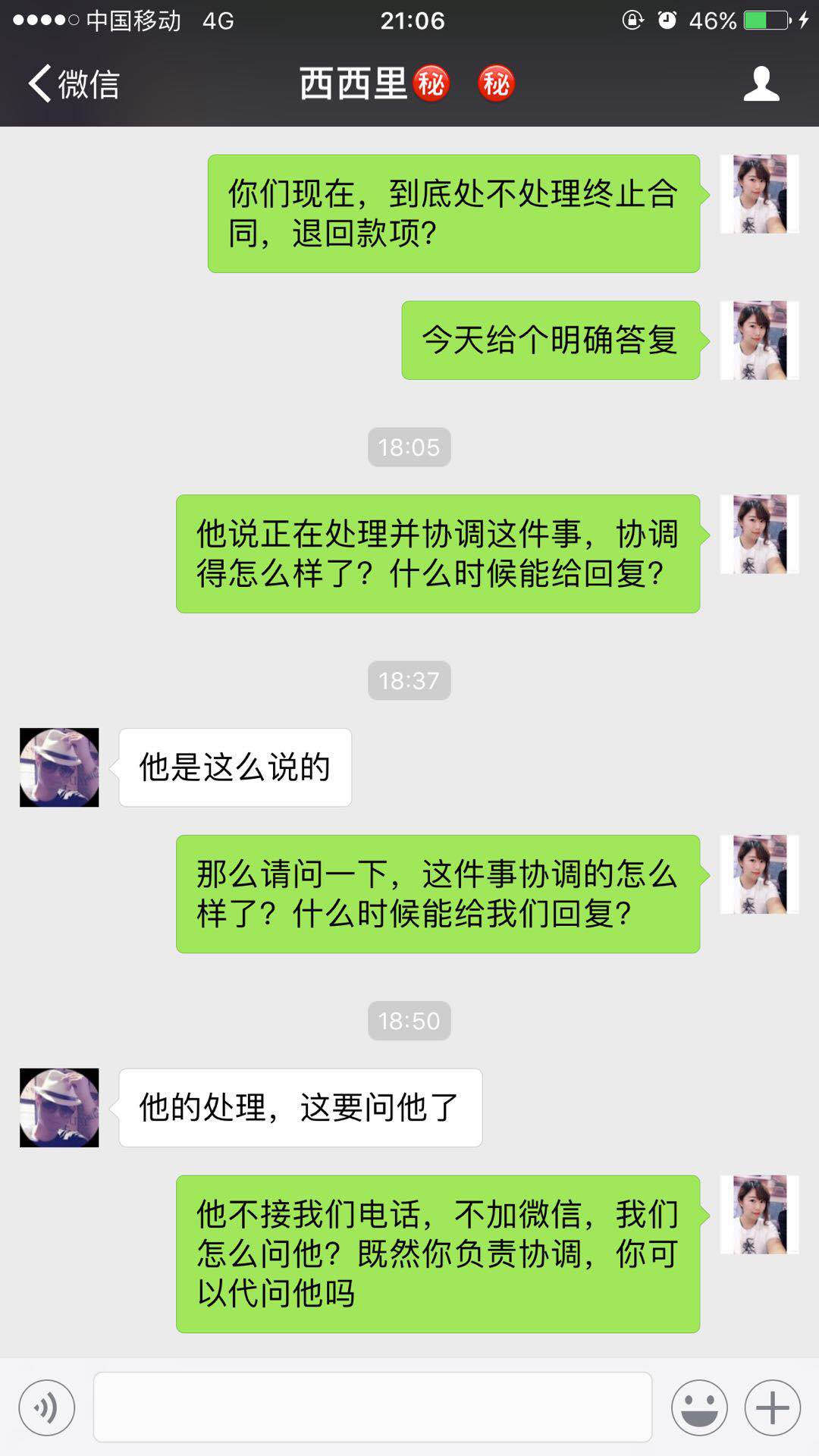 8月20日下午2時許,我們終于約得吉經(jīng)理在嘉定江橋萬達廣場肯德基內(nèi)繼續(xù)商談關(guān)于合同終止事宜,據(jù)吉所言其并無申請合同終止的權(quán)利,只有謝香榮可以操作此事,但至商談結(jié)束謝均未再出面,后我們在得到吉的答復(fù)將回去轉(zhuǎn)告謝。且承諾謝將于次日即8月21日必定會給予回電的情況下結(jié)束商談,并于晚間撤銷了之前在該網(wǎng)的投訴,希望能將此事以和談的方式解決。然而,吉在8月21日稱謝說此事會協(xié)調(diào),但詢問多次協(xié)調(diào)得怎樣?什么時候能給回復(fù),皆沒有答復(fù)。吉推脫此事要問謝,要我們自己詢問,我們在微信群里告知了其電話號碼的情況下,但謝始終不接電話,不回微信。詢問吉能否由其代為詢問,吉之后再也沒有回復(fù)。直至8月21日晚十點許,仍未收到吉監(jiān)理和謝香榮的回復(fù),且多次電話聯(lián)系對方均不予以接聽。鑒于對方不予配合及消極的處理態(tài)度再次提出該投訴申請。