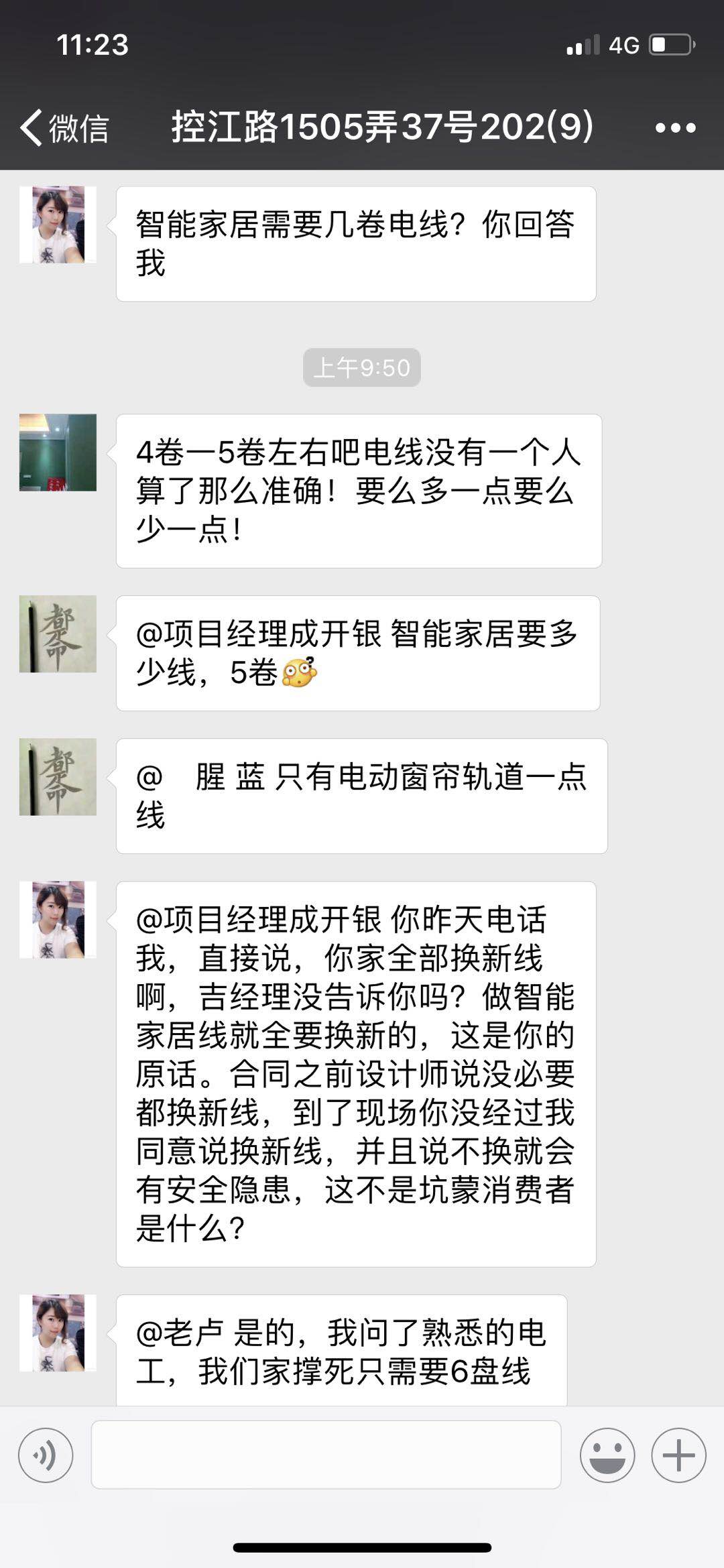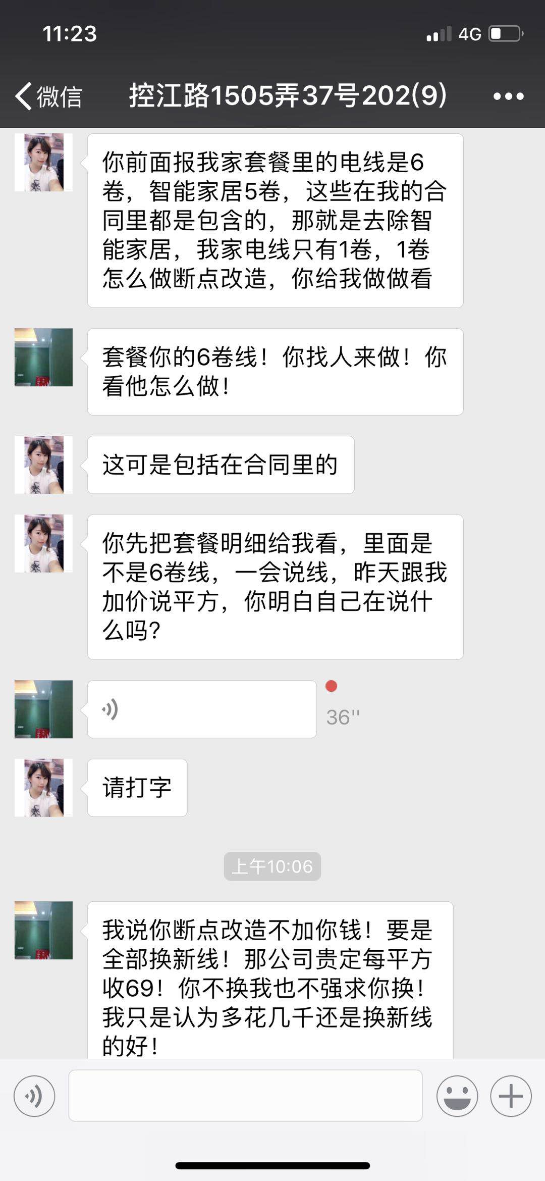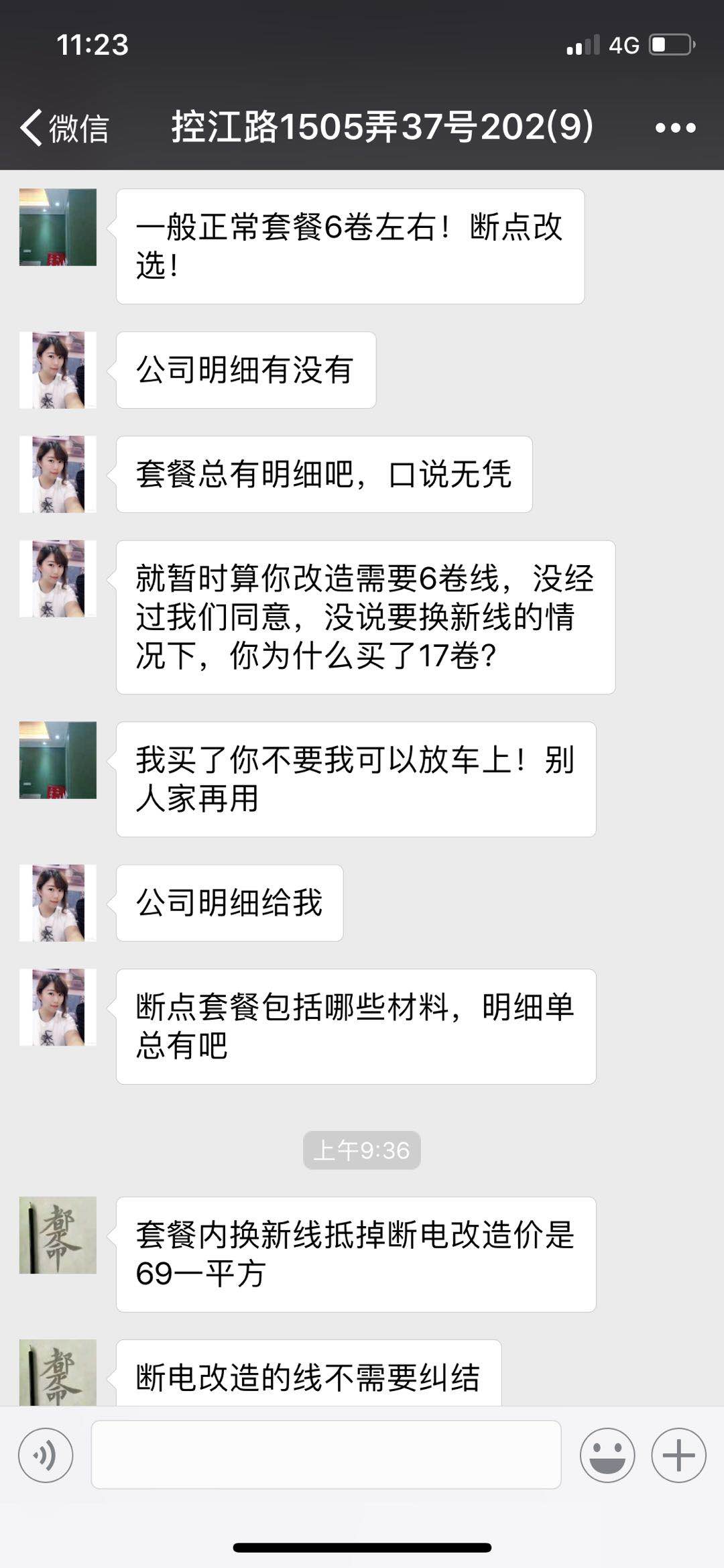 糾紛三:8月17日,水電工程開始的第一天,成開銀在未征得我同意的情況下,買入鋪設(shè)電路所需要的電線共17卷,并告知我房屋需要安裝其公司的智能家居需要全屋電路改造,不能使用舊線路。而該公司設(shè)計師在7月15日簽訂合同之日,已明知我房屋裝修需要安裝其公司的智能家居產(chǎn)品的情況下,仍然誘導(dǎo)我們采用所謂的斷點改造套餐,而現(xiàn)在鋪設(shè)電路時成開銀發(fā)現(xiàn)使用原電路斷點改造將造成嚴重的安全隱患,我也向進行施工的電工核實原電路老舊已無法使用斷點改造。成開銀在自說自話買完電線后告知我進行全屋鋪設(shè)新線的工程情況下,需要在原報價上增加每平方米69元錢,而當(dāng)值電工證實即使全屋鋪設(shè)新線也只需要各類電線約12卷,陳開銀答復(fù)由于安裝智能家居需要額外新線5卷,而實際只需要1卷。按照成開銀所述原斷點改造套餐一般已包含6卷電線,而該公司不答應(yīng)以增加新線卷的方式進行全屋電路鋪設(shè)。我認為該增項費用是由其公司設(shè)計師宣銀在簽合同時候以低價引誘的方式簽訂合同所造成的,且在我不知情的情況下成開銀私自進行采購和增項,其公司的該行為已構(gòu)成了欺詐消費和惡意收費。