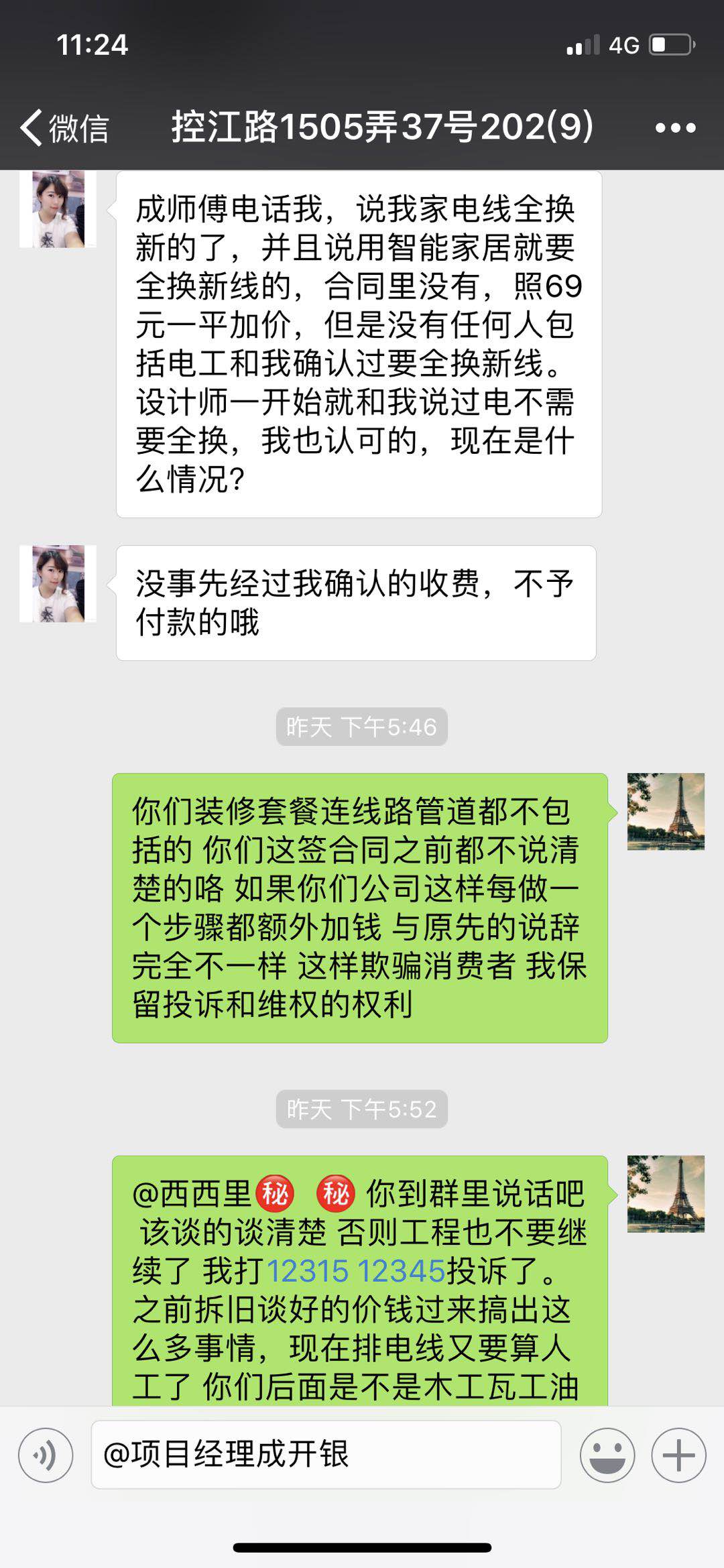 糾紛二:在2018年7月15日簽訂裝修施工合同之時,新設(shè)計師宣銀告知我所要裝修的房屋(控江路1505弄37號202室,二手買入)拆舊所需要的費用為3000-4000元,并不寫入合同內(nèi),而在8月6日,該公司原工程負責(zé)人朱乃兆到場后報出價格為10000多元,與設(shè)計師宣銀原報價相去甚遠,經(jīng)交涉拆舊工程由我自行找工人完成,并申請該公司更換了新的工程負責(zé)人成開銀。