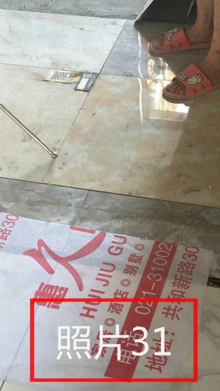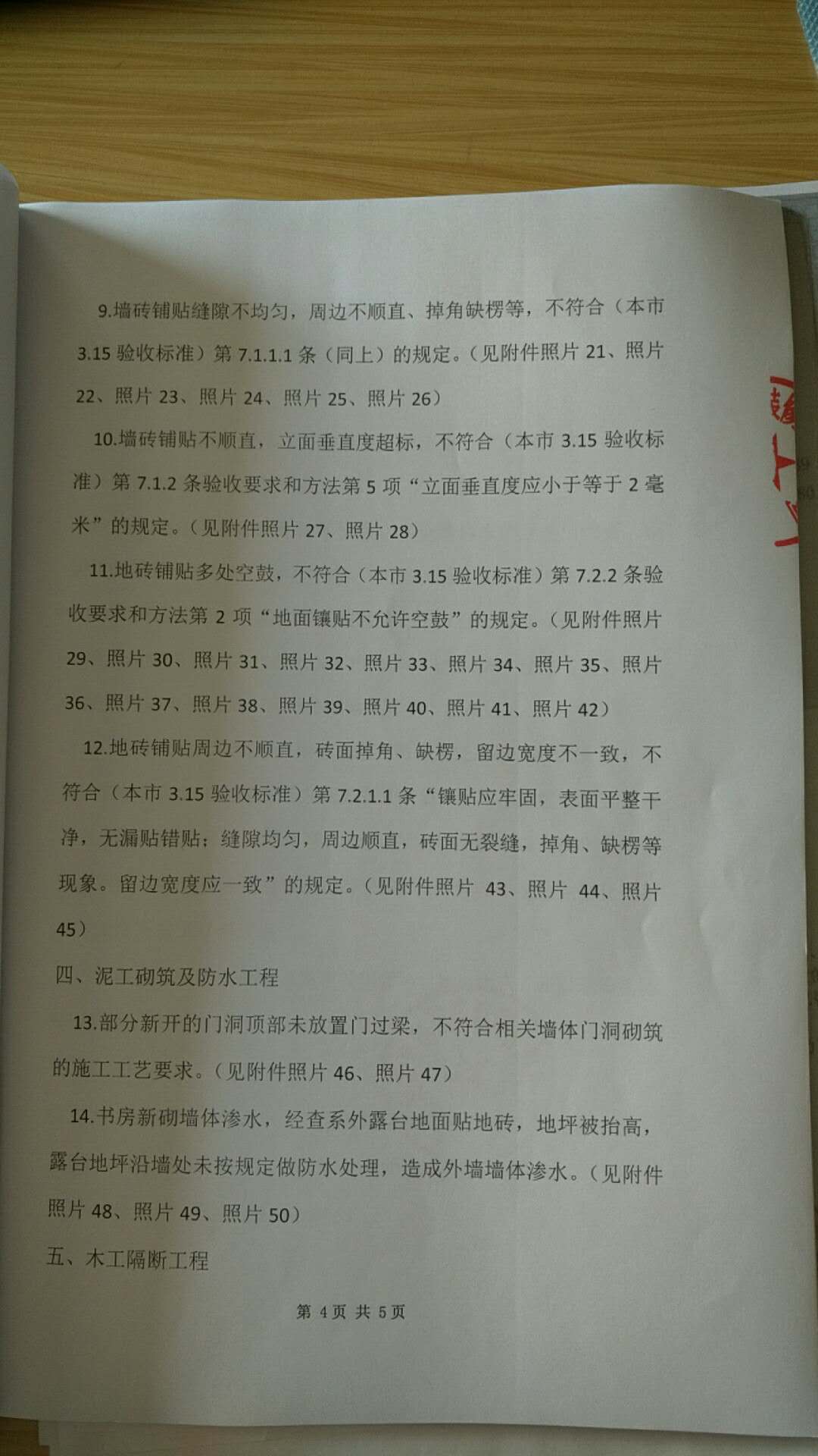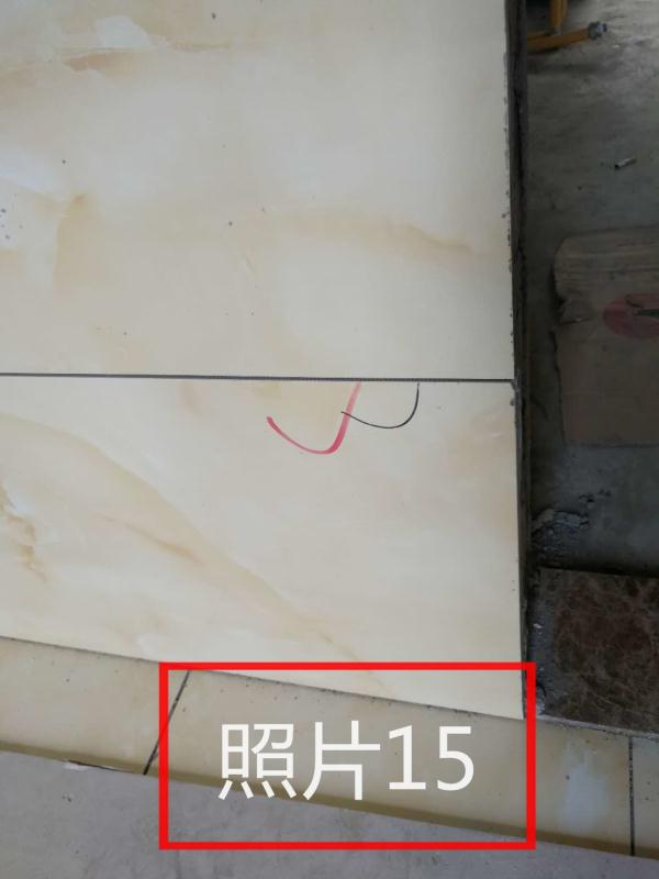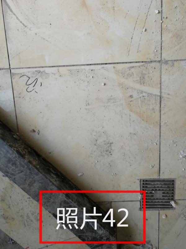 11.地磚鋪貼多處空鼓,不符合(本市3.15驗收標準)第7.2.2條驗收要求和方法第2項“地面鑲貼不允許空鼓”的規(guī)定。(見附件照片29、照片30、照片31、照片32、照片33、照片34、照片35、照片36、照片37、照片38、照片39、照片40、照片41、照片42)