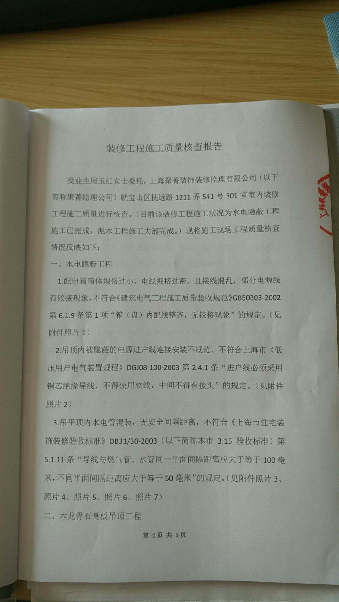 受業(yè)主周玉紅女士委托,上海聚菁裝飾裝修監(jiān)理有限公司(以下簡稱聚菁監(jiān)理公司)就寶山區(qū)撫遠路1211弄541號301室室內(nèi)裝修工程施工質量進行核查。(目前該裝修工程施工狀況為水電隱蔽工程施工已完成,泥木工程施工大部完成。)現(xiàn)將施工現(xiàn)場工程質量核查情況反映如下: