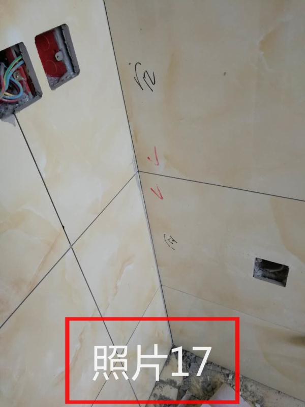 7.墻磚鋪貼多處空鼓,不符合(本市3.15驗收標準)第7.1.1.1條“鑲貼應牢固,表面色澤基本一致,平整干凈。無漏貼錯貼;墻面無空鼓,縫隙均勻,周邊順直,磚面無裂縫、掉角、缺楞等現(xiàn)象”的規(guī)定。(見照片15、照片16、照片17、照片18)