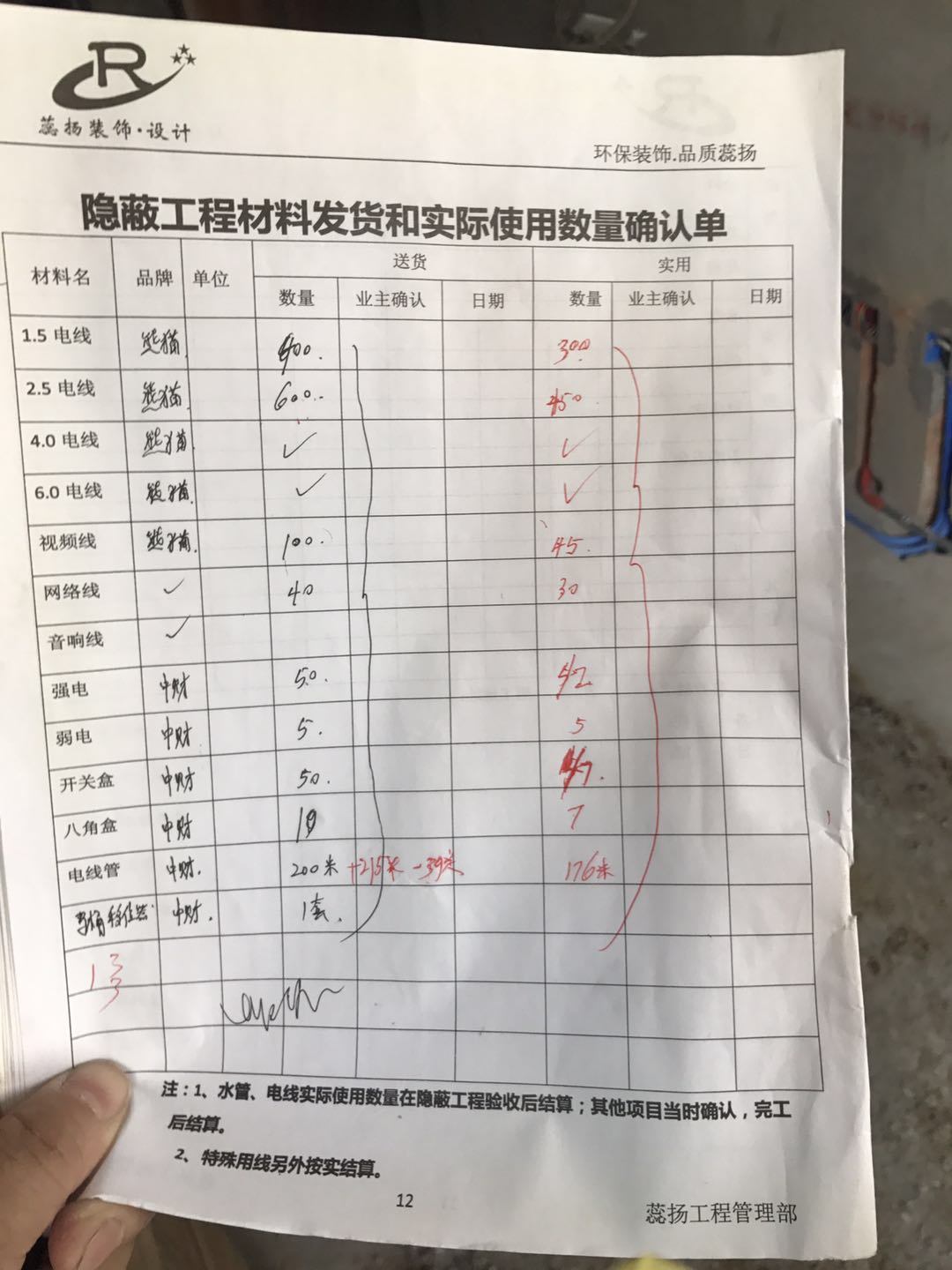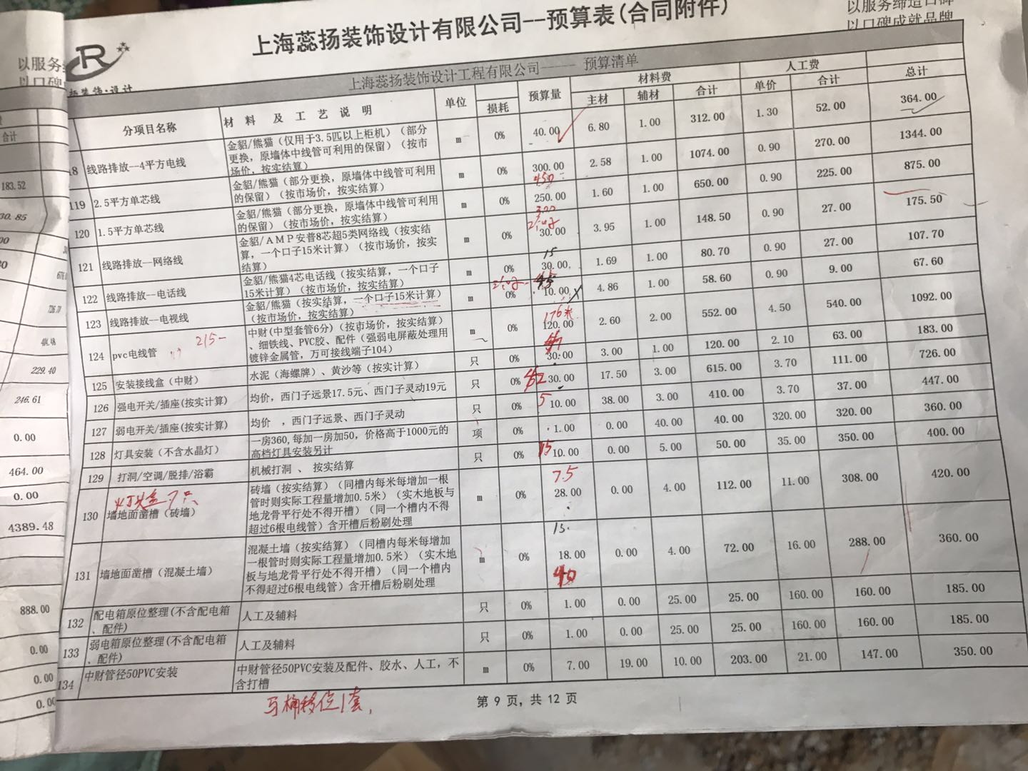 水電驗收是按實結(jié)算,為避免扯皮照理說施工方應(yīng)準(zhǔn)備好規(guī)范的核算單和驗收手續(xù)。然而當(dāng)天,隊長僅在預(yù)算表上手寫了部分項目實際米數(shù)(如下圖),甚至未標(biāo)明馬桶移位器價格、水管實際米數(shù),也并無計算增項總價。我回家后自己計算才發(fā)現(xiàn)增項達4500元(還未包含馬桶移位等),水電欄總價近15000元,增項幅度高達53%。我咨詢過業(yè)內(nèi)專業(yè)人員,通常線管與電線的比例是1:3,現(xiàn)在的比例是1:4.26,亂報米數(shù)導(dǎo)致增項的問題顯而易見。