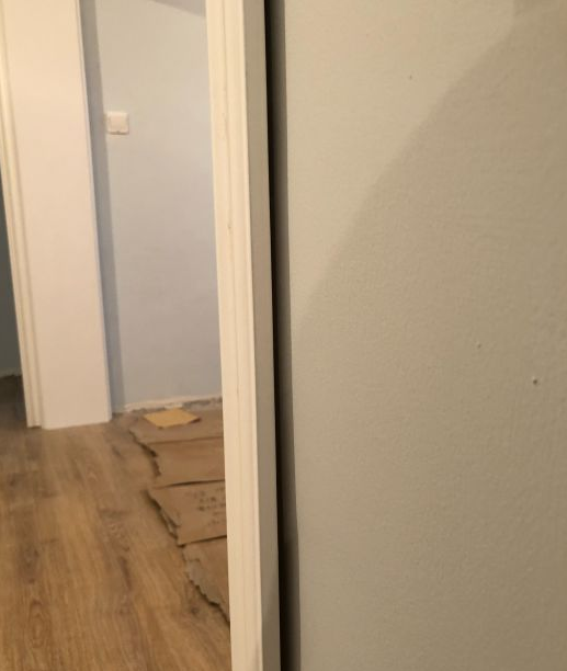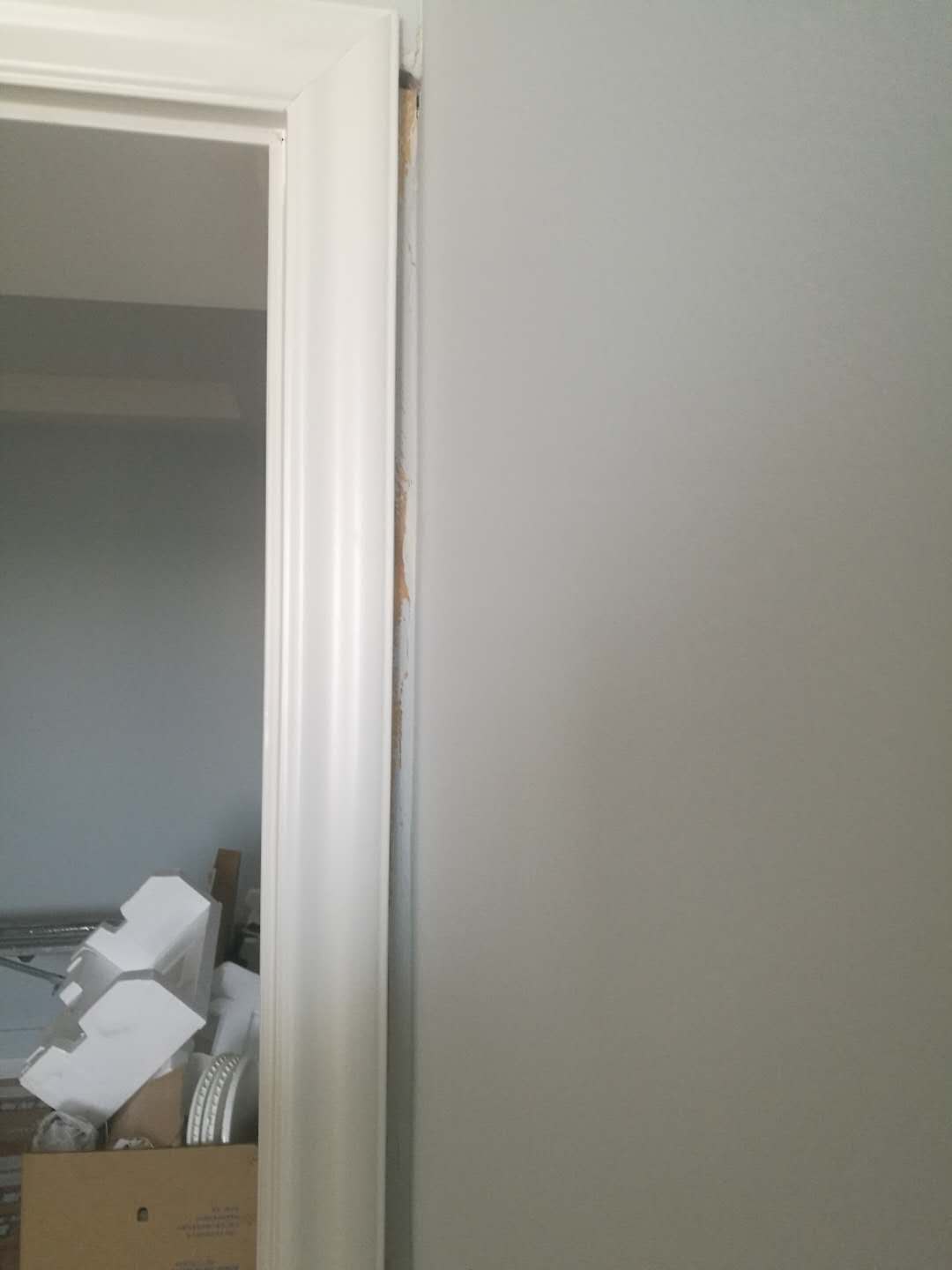 7.門套和墻面空隙相當于兩個一元人名幣的厚度(目測可能不止),說明墻壁沒有平整度可言,項目經理推脫墻壁自身有誤差拒不整改墻壁平整度。