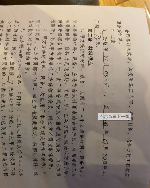 1.合同約定工期為2018年5月5日至2018年7月20日竣工,為配合施工2018年4月23日就讓施工隊進場,至今逾期交房一個多月,還有很多項目沒做。