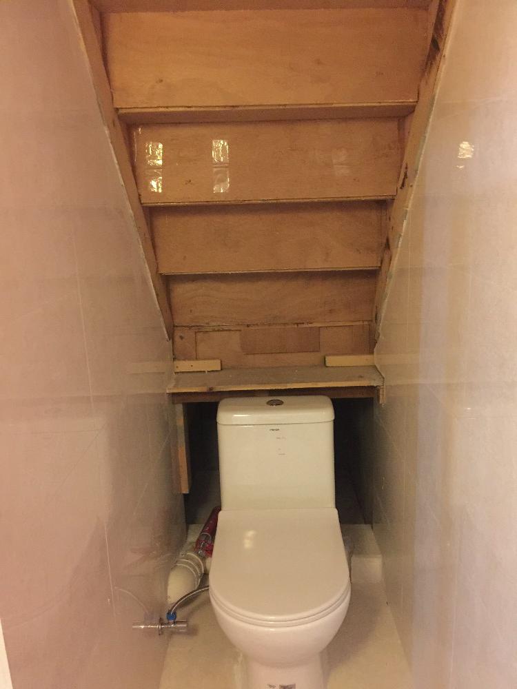 2、新設(shè)衛(wèi)生間工程簡陋,(1)付了電線的錢卻未埋線導(dǎo)致衛(wèi)生間沒有燈;(2)頂部位置居然未做找平未貼瓷磚;(3)未做防水。