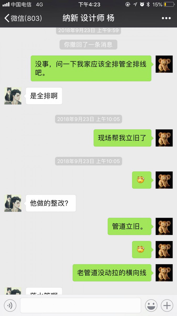 新家買在松江佘山,老家在徐家匯。老母親為了不折騰選擇了在家附近的上海納新室內(nèi)裝潢有限公司。合同簽的是全包,合同價(jià)格是7.8W但是其中部分打星號(hào)的可以自采。由于簽訂合同前和設(shè)計(jì)師交底水電需要全拆全排(電線全排,管道全排),并由原先的價(jià)格增加1000元升級(jí)整改項(xiàng)增加到全排全改項(xiàng)。