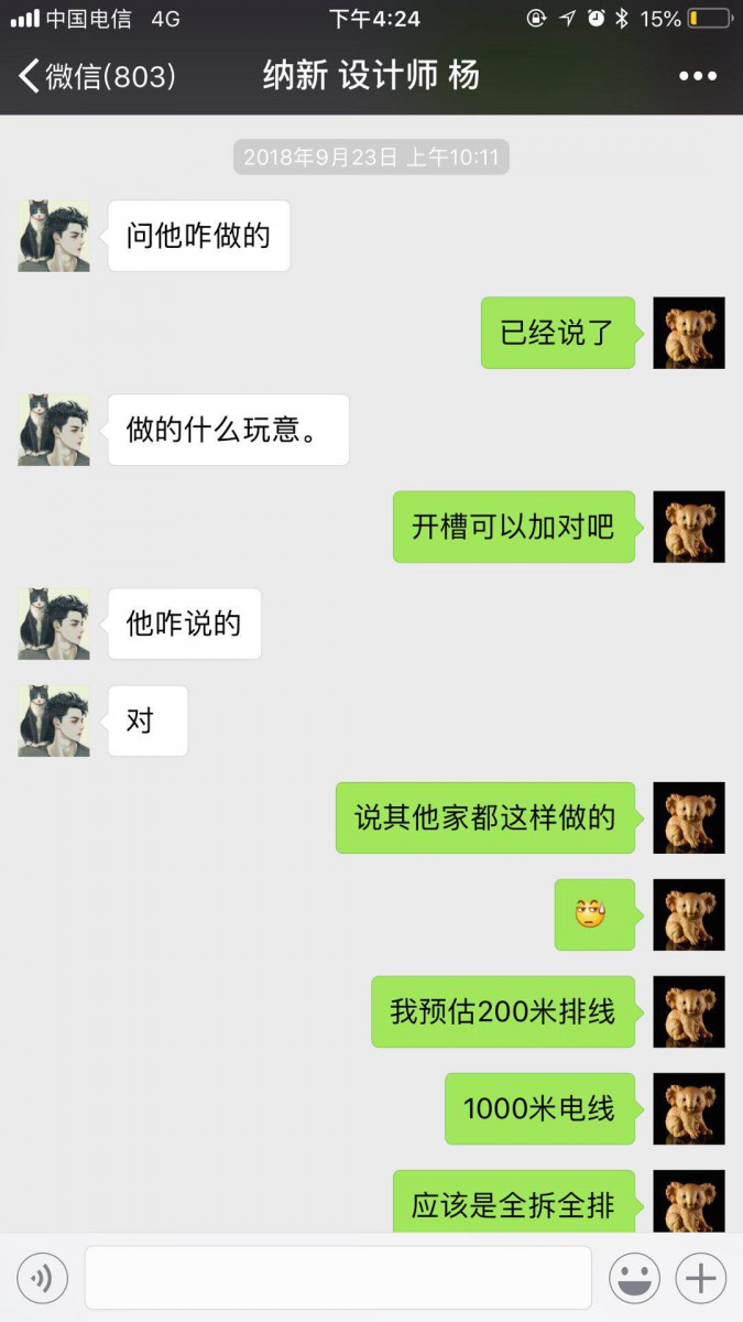 家中裝修于 9月15日正式開(kāi)工,由于工作繁忙本人于9月22日現(xiàn)場(chǎng)巡場(chǎng)時(shí)發(fā)現(xiàn)。電線未按原先設(shè)想的全部拆除再進(jìn)行鋪設(shè),而是由老管道中穿出并套新管,部分線路未按圖紙施工。并由于這個(gè)問(wèn)題與項(xiàng)目經(jīng)理倪俊國(guó)交涉。要求全拆全排。得到的答復(fù)是:是全排,是線全排!而且開(kāi)槽只算了20米。我于次日9月23日一早與原設(shè)計(jì)師進(jìn)行微信溝通并確定,我家是電線和電管道全部都是全拆全排,開(kāi)槽增加是可以另外再算的。并于下午去了上海納新室內(nèi)裝潢公司宜山路門店進(jìn)行交涉,該公司監(jiān)事倪俊學(xué)推脫是設(shè)計(jì)師寫(xiě)錯(cuò)了,我反過(guò)來(lái)推算單獨(dú)950元管道費(fèi)用可以做400米的管道鋪設(shè),如果按整改項(xiàng)制作是否要退該部分的錢。監(jiān)理又說(shuō)這部分按項(xiàng)計(jì)算,無(wú)法退款。我認(rèn)為前期電線和排管是按項(xiàng)計(jì)算的話后期開(kāi)槽也不能單獨(dú)按米來(lái)計(jì)算這兩項(xiàng)是非常矛盾的,如現(xiàn)場(chǎng)電線排布項(xiàng)錯(cuò)誤的必須整改,但在交涉過(guò)程中該公司態(tài)度蠻橫從上到下一直敷衍推脫責(zé)任。目前由于該公司的態(tài)度情況,我要求停工并結(jié)算費(fèi)用。該公司監(jiān)事不作為推脫需要我們業(yè)主自己找項(xiàng)目經(jīng)理,另一說(shuō)辭強(qiáng)調(diào)第一次3000的定金不予退還且不計(jì)算再施工費(fèi)用內(nèi)!我認(rèn)為從合同角度來(lái)說(shuō)也非常不合理。