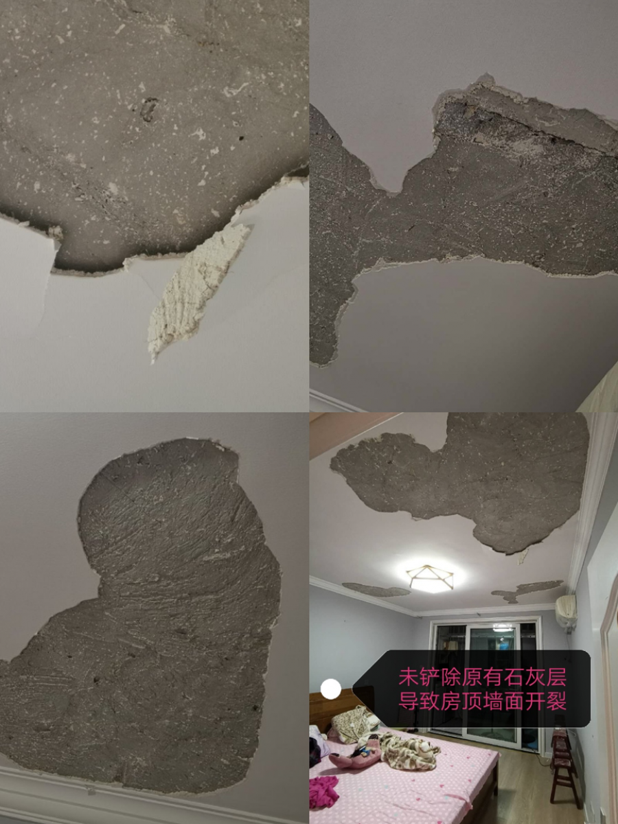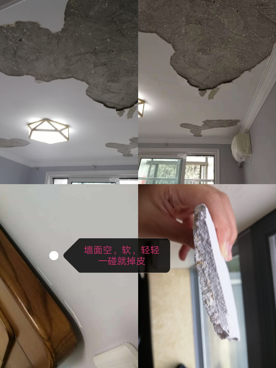 (4) 接下來墻頂開始開裂,三個房間房頂大大小小裂縫數(shù)不勝數(shù),2018年10月14日,找到隊長周鳳才來家里修補裂縫,隊長要求我們支付人工費和材料費才給修補,并且只修補開裂部分,其余部分用手敲,空的部分才修補。在鏟開墻頂部分墻面后,讓我們大吃一驚,房頂所有地方均已空了,師傅給我們所謂的刷墻只是在墻表面輕輕刷了一層,房子墻面原來的部分全未鏟除,這就是所謂的偷工減料并且騙取人工費。(因為我和我先生工作特別忙,平時并未有時間監(jiān)工,才給了裝修隊長有乘之機)周鳳才以為只是小修小補就能解決的問題,現(xiàn)在看來整個墻頂都要鏟除,重新粉刷,無奈之下,他要我們找到裝修公司協(xié)商,自己倉皇逃走。