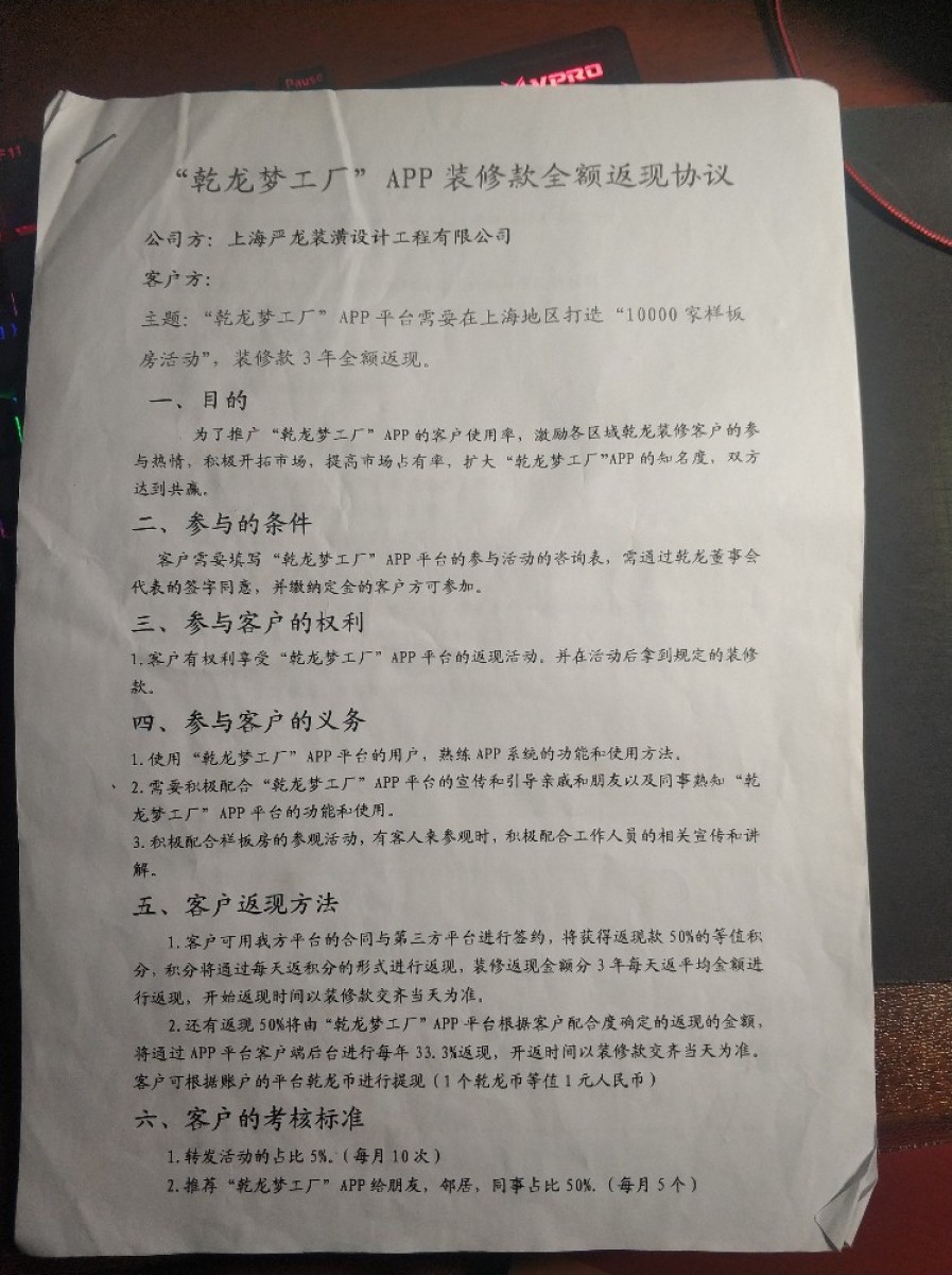 去年7月份簽訂合同,找的乾龍裝修公司(公司名字:上海嚴(yán)龍裝潢設(shè)計(jì)工程有限公司),當(dāng)時(shí)乾龍的裝修有一個(gè)活動(dòng),就是裝修費(fèi)用在乾龍自己的APP上,會(huì)以積分的方式,三年全額返還。積分通過(guò)每天返積分的形式返現(xiàn),每天返還??蛻艨梢愿鶕?jù)莊戶平臺(tái)的積分進(jìn)行提現(xiàn)。該活動(dòng)簽訂了返現(xiàn)的協(xié)議,并且雙方簽字,乾龍蓋公章。