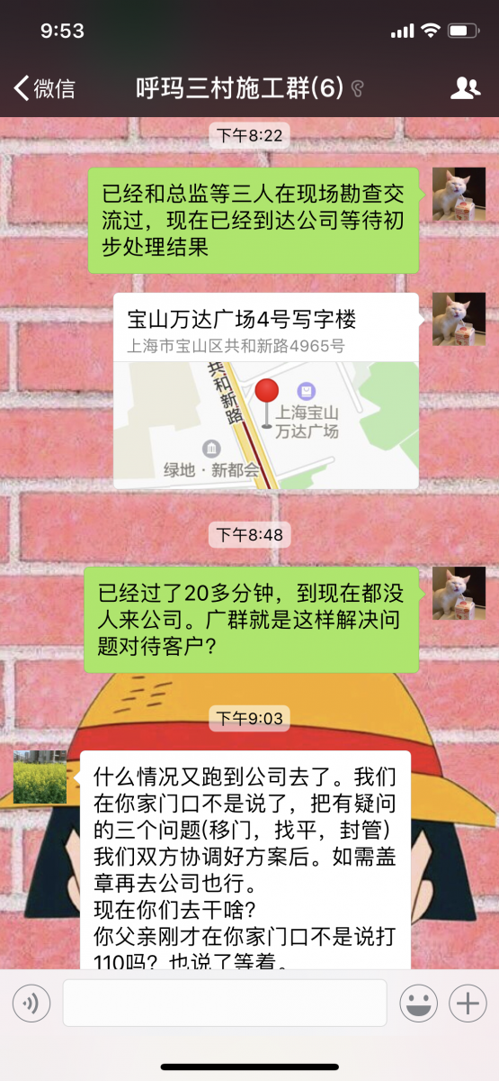 五、從來都是我們主動找裝修公司溝通,溝通過程中,裝修公司人員態(tài)度傲慢,各種拖延推諉,不積極主動解決問題!曾到我家鬧事敗壞聲譽(yù),在公司報警驅(qū)趕我們
