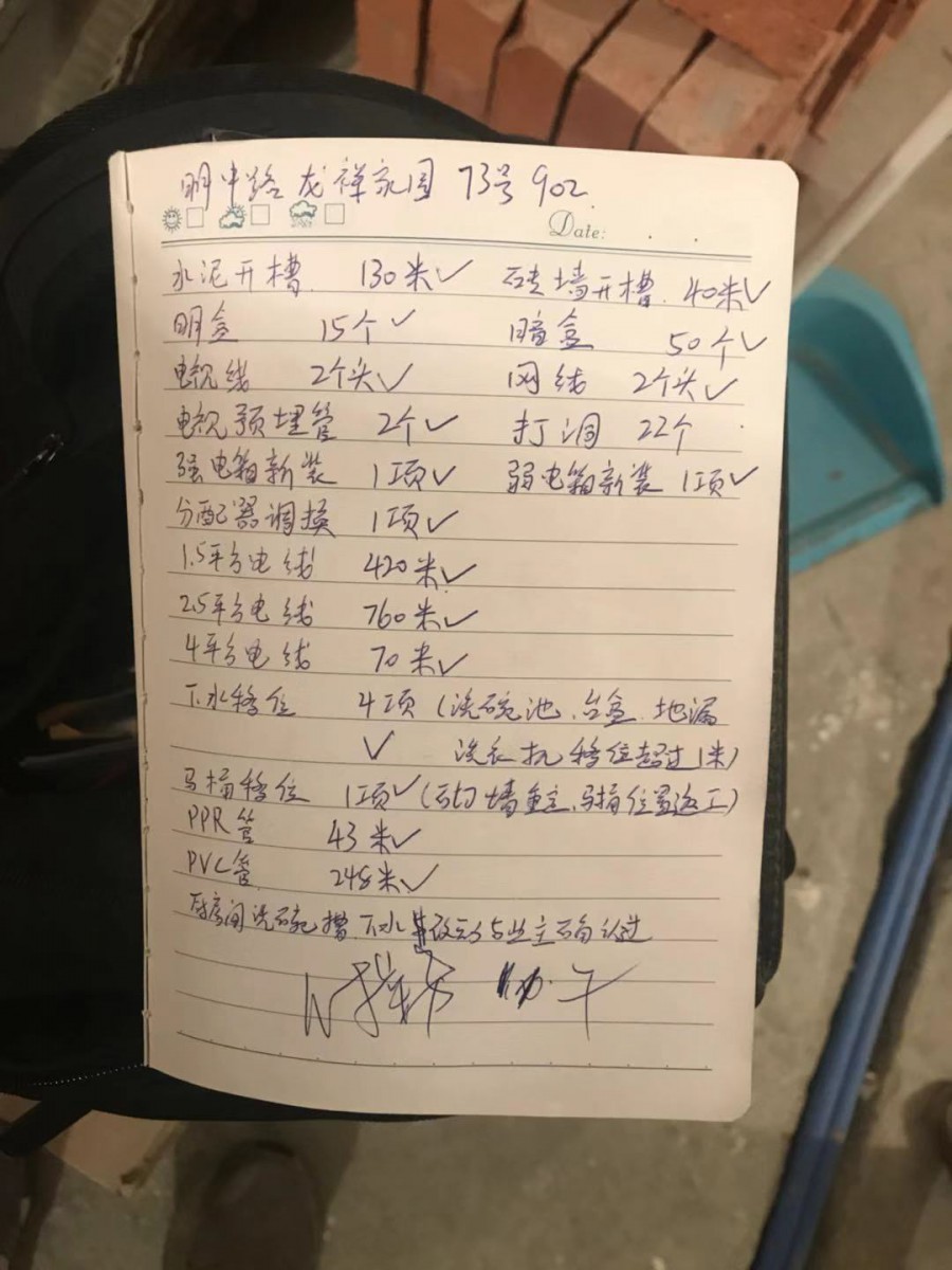 1.55平米的套內(nèi)面積,預(yù)算電線共使用550米左右。水電驗收時水電工報1390米,我對電線路線和實用情況進行了疑問,項目經(jīng)理和水電工無法提供具體材料結(jié)算清淡。我要求共同對使用電線進行實測,項目經(jīng)理拒絕上門測量,并要求業(yè)主自行測量。公司負責(zé)人也無法聯(lián)系上。