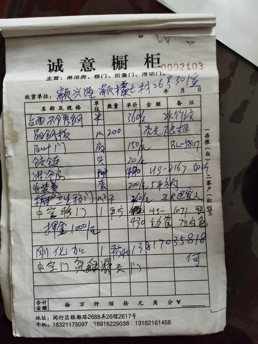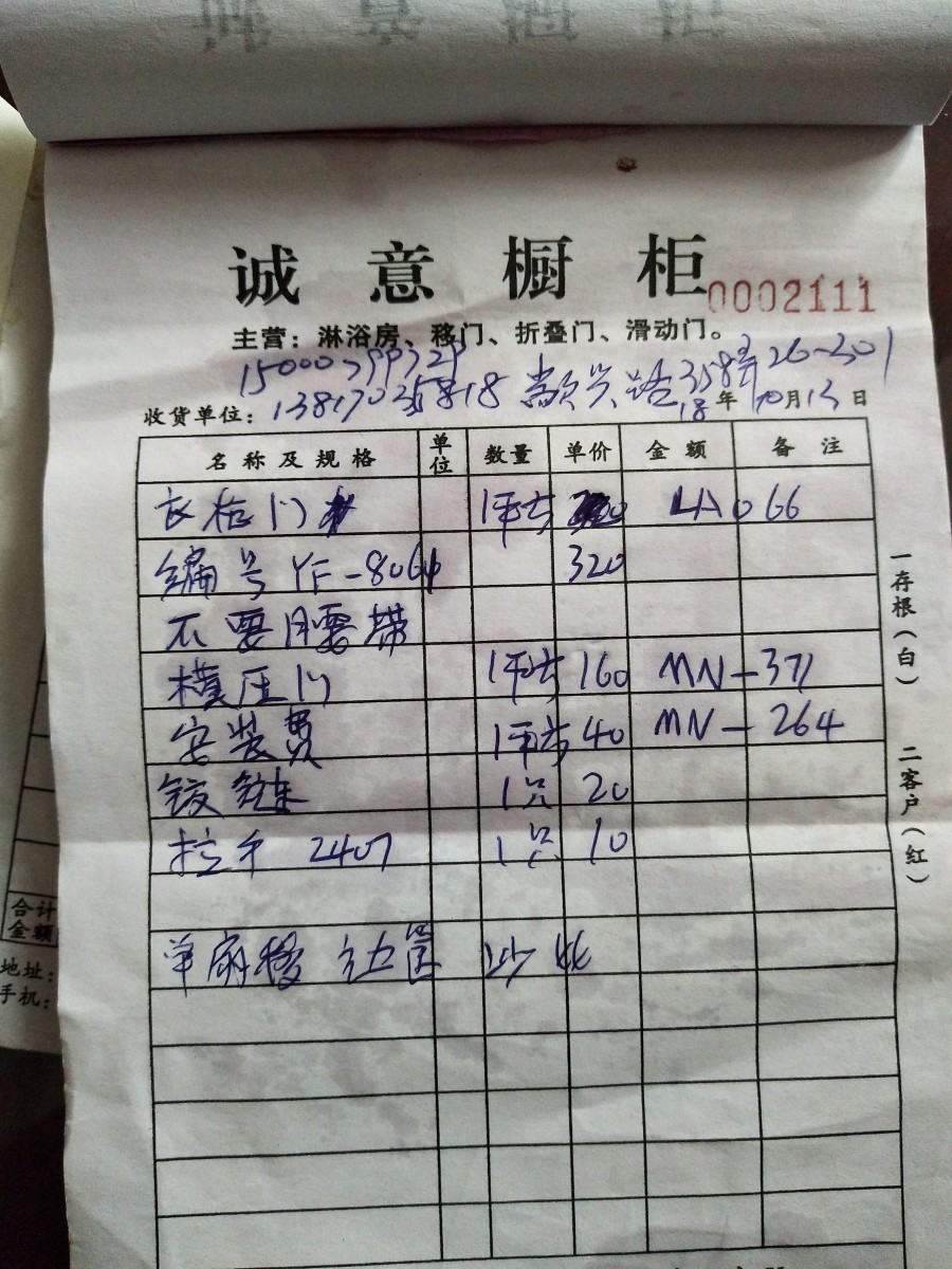 2、衛(wèi)生間鋁合金移門只有2.8平方米,誠意櫥柜強行按3.0平米收費。
