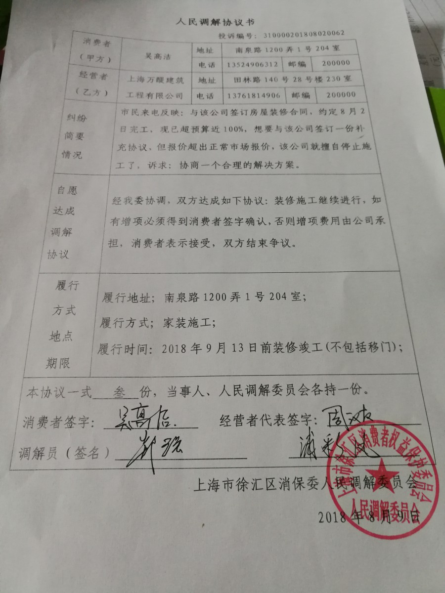 | 投訴類型 | 施工質量 | 投訴人 | 吳** | 被投訴單位 | 萬醍國際設計 |
