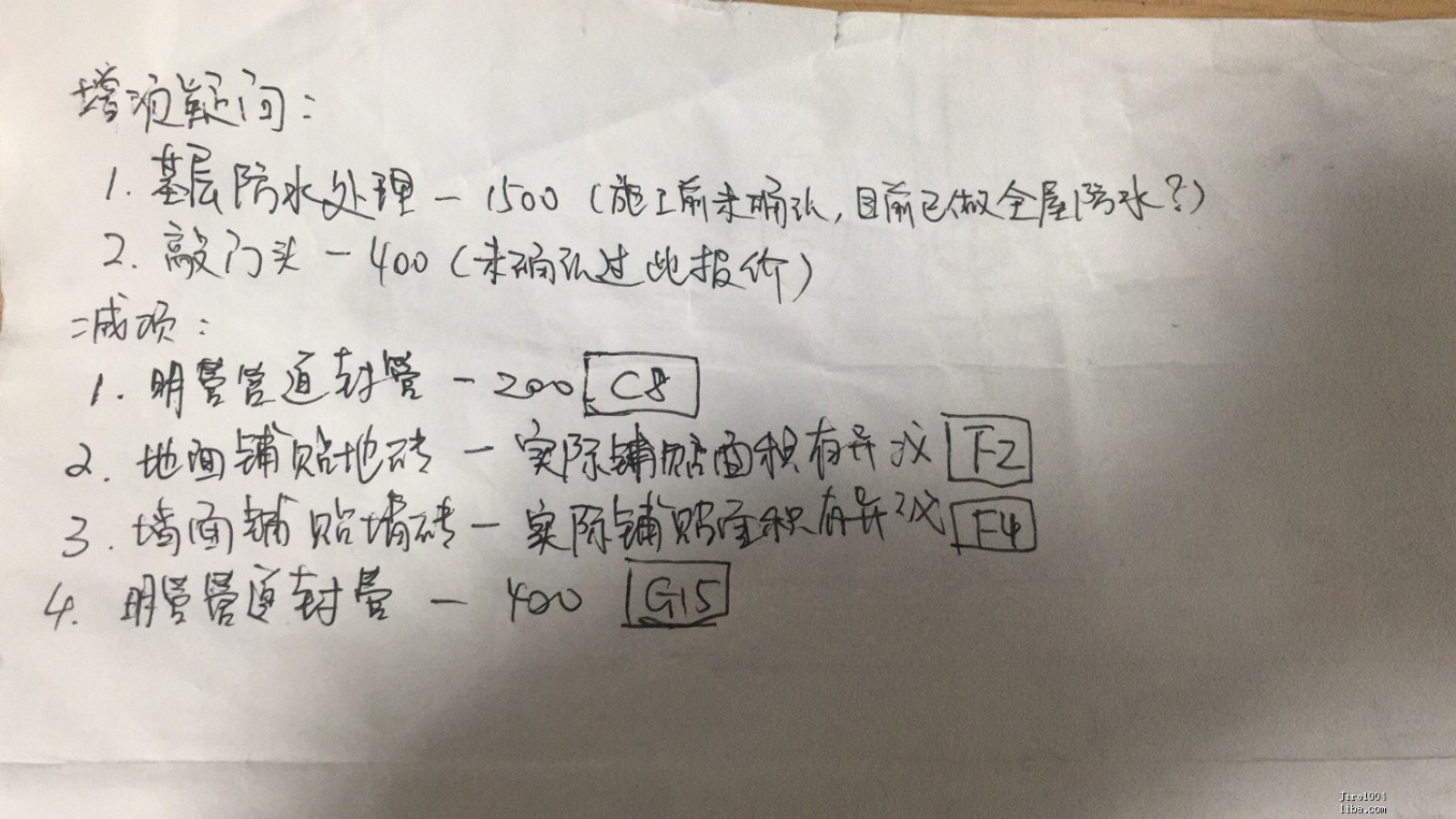 第二個(gè)case,漆刷了幾次,眼看著要到新擬定的100元賠償金了,就趕緊找我核算繳三期款了。但這個(gè)時(shí)候我以沒有確認(rèn)驗(yàn)收完工,無法計(jì)算最終賠償金為由暫緩了繳納,同時(shí)提出了對(duì)增減項(xiàng)的異議。(這里有必要提一嘴,其他找了他們家裝修的朋友也有反饋,核算增減項(xiàng)的時(shí)候全是誤差,該扣減的絕不扣減,該增的一項(xiàng)不少甚至有多)我仔細(xì)核算了增減項(xiàng),跟他們公司的增減項(xiàng)出入較大,我把我的異議提出后就在未收到過關(guān)于增減項(xiàng)的update。以上兩個(gè)case的細(xì)節(jié)圖如下,有空的看一瞅兩眼我家的糟心事兒。