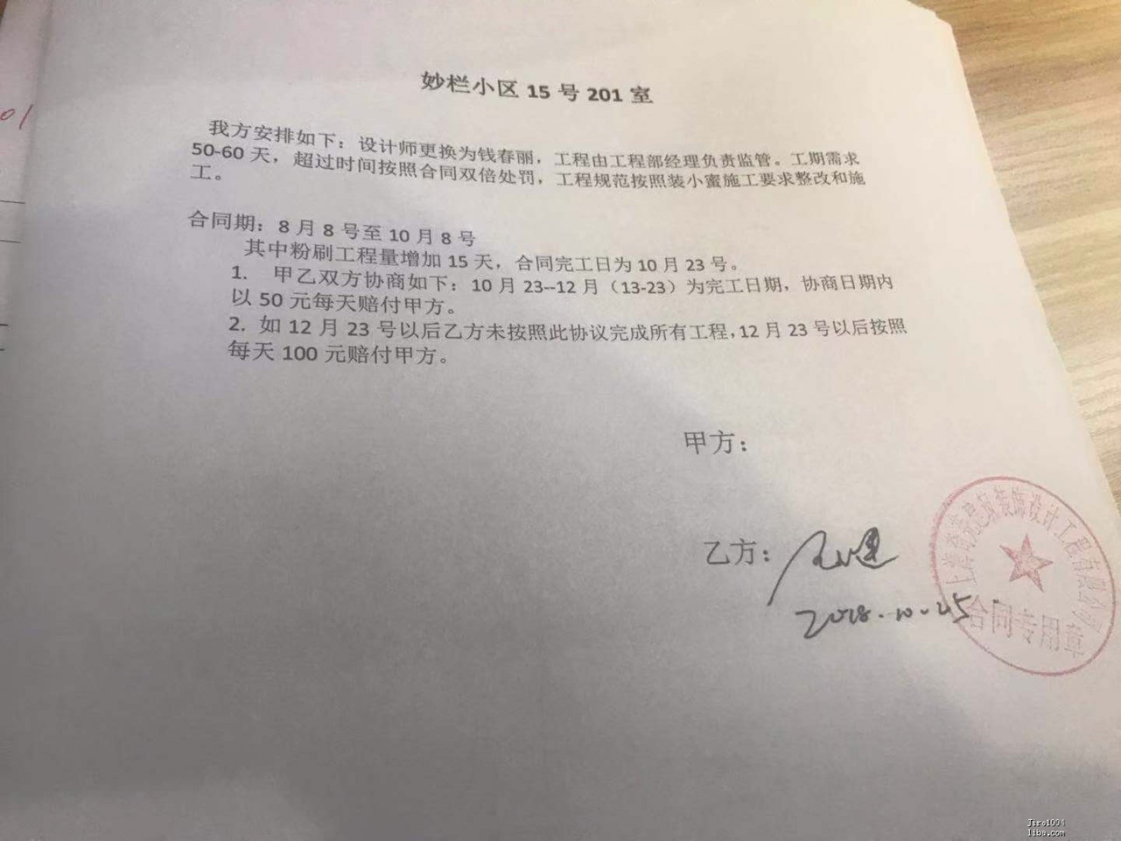 10.20來了一個(gè)自稱為雨果公司工程部經(jīng)理的人,碰面地點(diǎn)是在施工現(xiàn)場(chǎng),來了之后態(tài)度十分友好??戳爽F(xiàn)場(chǎng)后,直接承認(rèn)了之前公司委派工人不力的問題,也承認(rèn)了現(xiàn)場(chǎng)水電中的低級(jí)錯(cuò)誤并且溝通給出了整改及賠償方案,最后想著都弄了一半了還是硬著頭皮繼續(xù)下去了。新擬定的賠償方案是,原8.05簽訂的合同,理應(yīng)10.08完工,由于我自身耽誤的時(shí)間,原工期完工期延長(zhǎng)至10.23。從10.23日起,至12.13日,約50天的工期內(nèi)按照合同上的約定,按照每天50元的賠償賠付(我也不知道當(dāng)時(shí)怎么就鬼使神差的同意了這個(gè)價(jià)格,如果最近你要簽裝修合同,這里的賠償金請(qǐng)往高了走,誤工就靠這個(gè)賠償損失了),12.13日之后,按照每天100元賠付直至工期結(jié)束。我是打算房子裝修好了做民宿的,大家可以看看這個(gè)賠償金對(duì)我來說完全就是杯水車薪。