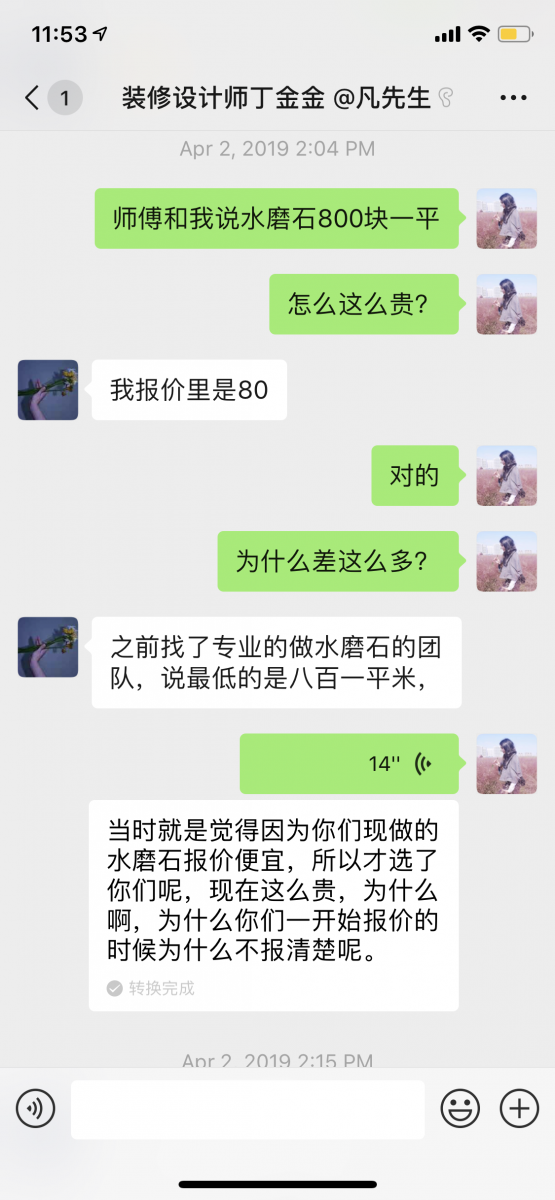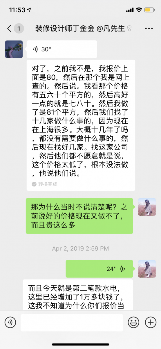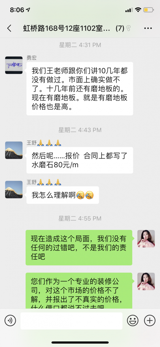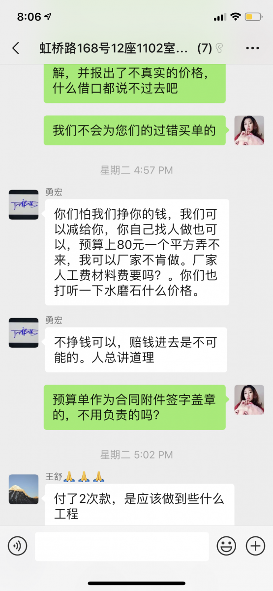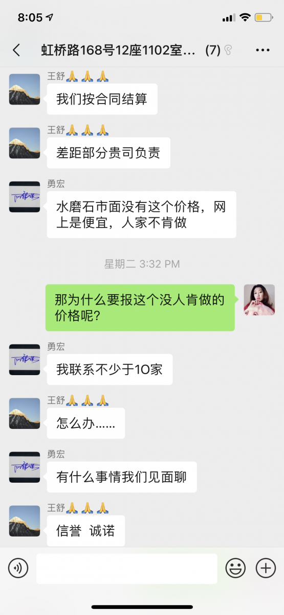 合同簽訂當(dāng)日我付了30%(17462.4元),現(xiàn)在水電做做完了,按照合同在水電驗(yàn)收當(dāng)日付款35%(20372.8元),但是實(shí)際在水電驗(yàn)收日,裝修公司說(shuō)需要加價(jià)13000多元,當(dāng)日總共付了32978元,又和我說(shuō)之前說(shuō)好的報(bào)價(jià)單上的80元/平的現(xiàn)制水磨石地板做不了,要漲價(jià)至800元/平,該公司負(fù)責(zé)人何勇宏先生重新發(fā)給我項(xiàng)目單,表示整個(gè)項(xiàng)目一共需要加價(jià)34396元,總價(jià)為92604元,與原預(yù)算58208元相差很大。