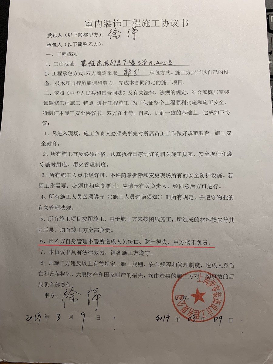 另外,該公司所暴露的相關問題,均為管理問題,根據(jù)雙方事先簽訂的《室內(nèi)裝飾工程施工協(xié)議書》第二條第6款規(guī)定:因乙方自身管理不善所造成人員傷亡、財產(chǎn)損失,甲方概不負責(投訴依據(jù)13)。