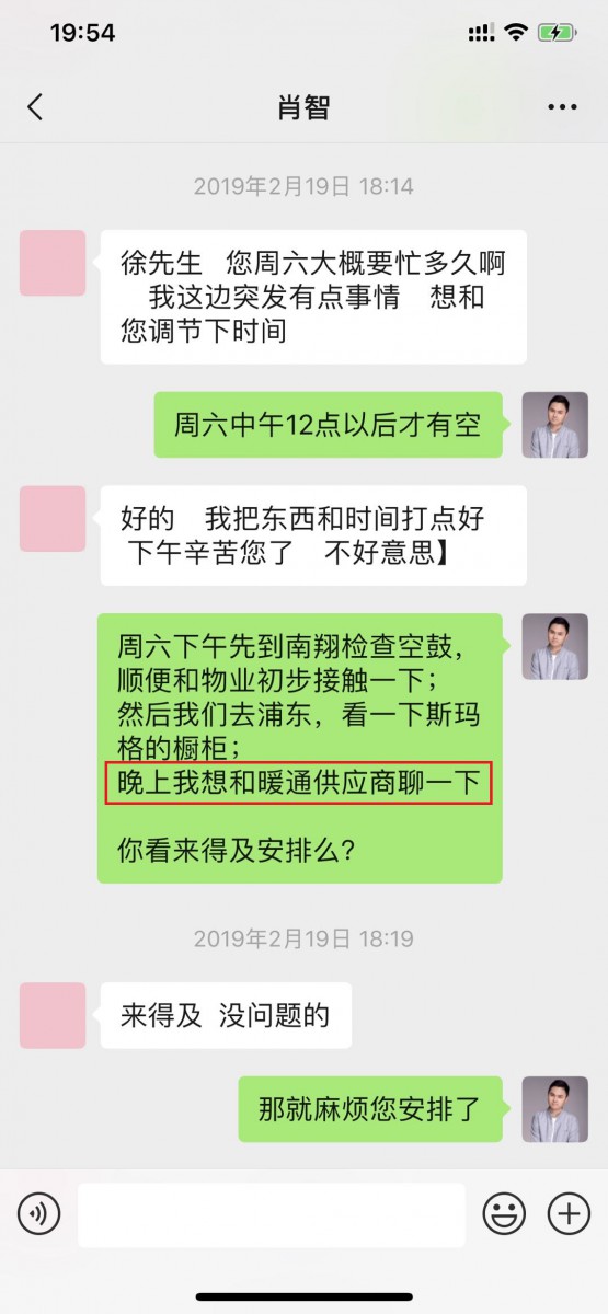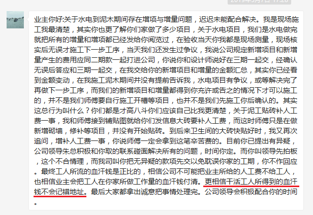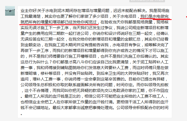 2. 水電和泥木的驗收,也是由我方發(fā)起組織,且泥木工驗收時,施工隊長缺席,設計師遲到。泥木工師傅提前一周便已周知所有人,泥木施工將于5月1-2日間完成。但是直至4月30日下午,該公司仍沒有任何人預約我方驗收事宜。我方只好致電施工隊長詢問,對方表示五一要回老家休息。最終經(jīng)我方向該公司管理層投訴,方才爭取到5月3日上午的泥木驗收。而根據(jù)施工合同附件《工程預算表》后備注3約定:施工工期如遇國定假日,物業(yè)不讓工期實行,工期順延。而此次五一,我方小區(qū)物業(yè)是允許繼續(xù)施工的。像驗收和交底這種沒有噪音的項目,物業(yè)更加不會阻攔??梢娫摴鞠嚓P人員在工程管理的時間安排上,存在管理上不作為的怠工行為。