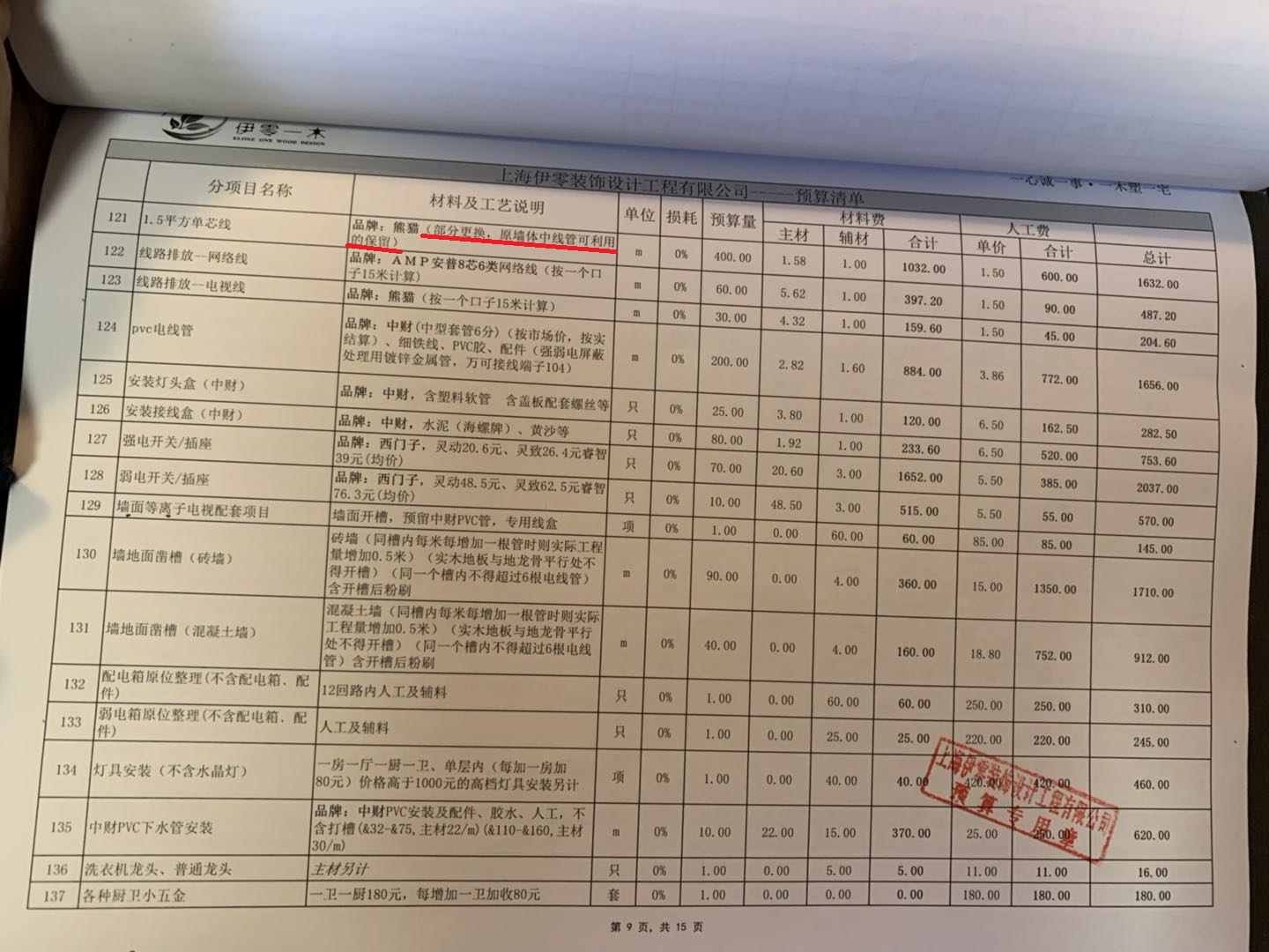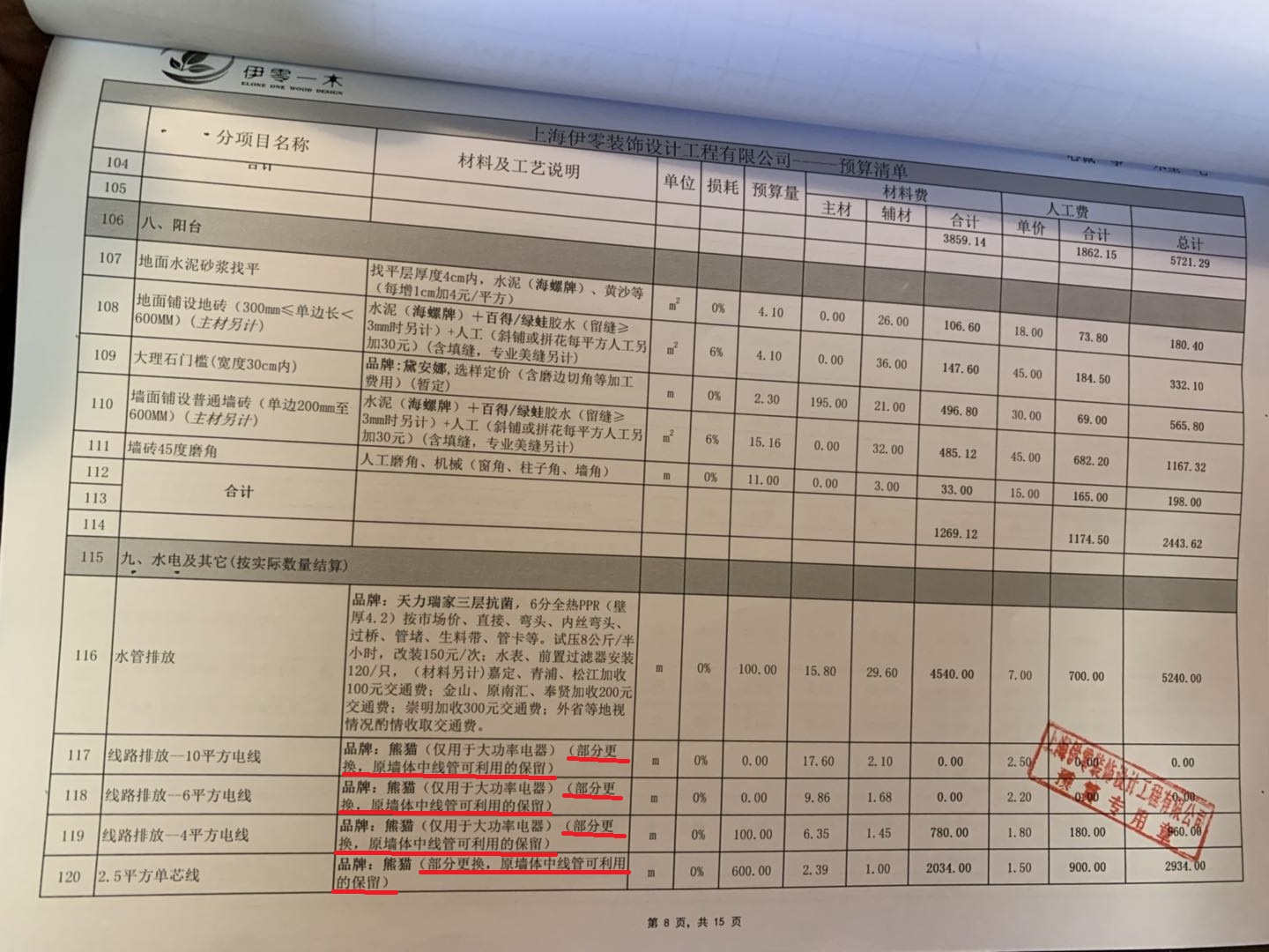 3. 該公司在工程造價清單中,明確標明,盡可能利用我方固有線管(投訴依據(jù)9-10),然而水電進場交底時,該公司施工隊長孔令社以固有線管轉角為90度,無法重新穿線為由,要求全屋重新排線。我方對此工程細節(jié)并不了解,本著信任的態(tài)度予以確認。但施工完成后,根據(jù)該公司提供的費用結算清單,相比原工程造價清單,PVC線管多出279米,4平方電線多出164米,2.5平方電線多出329米,1.5平方電線多出100米,均被施工隊長以全屋重排為由解釋。而事后經(jīng)我方與多名鄰居確認,固有線管是可以重新穿線的。