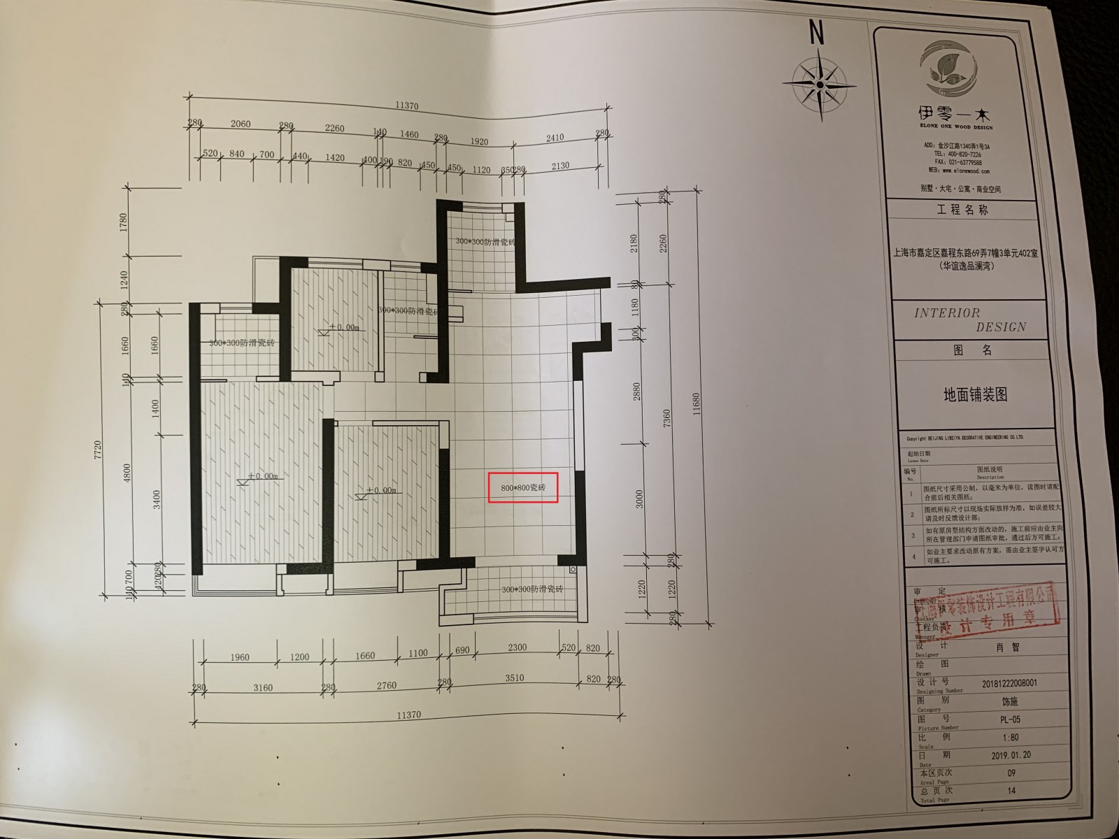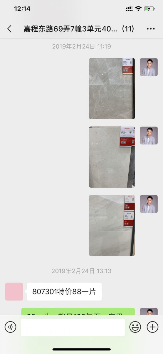1. 該公司于2019年1月20日隨設計合同簽訂的設計圖紙中,明確標明我方客餐廳鋪設地磚規(guī)格為800 X 800(投訴依據(jù)1),我方于2019年2月24日(施工合同簽訂第二日)在該公司合作的瓷磚供應商處選定瓷磚型號后,當即發(fā)在施工微信群中,該公司設計師肖智當即做出回復,表明其已知曉(投訴依據(jù)2-5)。
