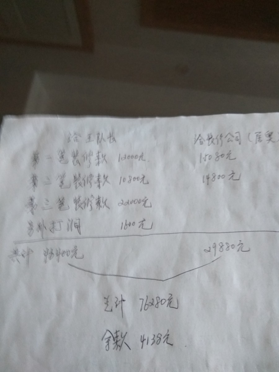 3.對裝修預(yù)算款中沒有使用的材料及人工費、以及在裝修過程中虛高、重復(fù)計算、多收了不合理的部分錢進行退款,而且在裝修過程中王隊長經(jīng)常要錢,我多次和他說預(yù)算中已算過,他說最后結(jié)賬時會減掉的,否則他們就不開工,所以現(xiàn)在他們不肯結(jié)賬,(我已交給王隊長46400元,付給居奧裝潢工程有限公司29880元,合計76280元)。