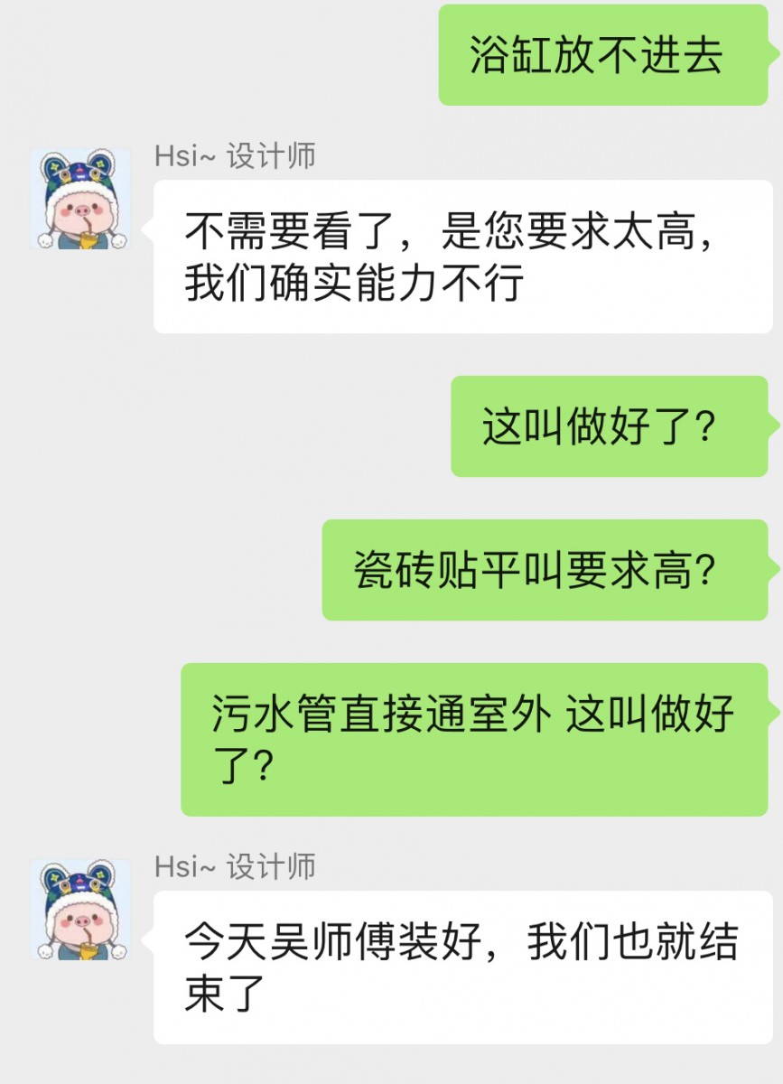 所有安裝材料的尺寸都是在3個月前通知施工方,圖片形式書面通知。結(jié)果安裝時候,龍頭離地面過低,浴缸放不進(jìn)去,壁掛馬桶離地面太近,等太多問題,且裝修公司的回復(fù)是:他們結(jié)束了,不管了。