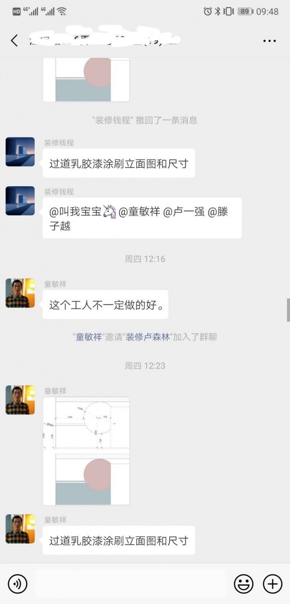 之后在項(xiàng)目經(jīng)理A的督促下,施工一直走走停停,但是在幾乎硬裝臨近結(jié)束,項(xiàng)目經(jīng)理A突然退群,這時(shí)監(jiān)理童某變成了銜接人而前任項(xiàng)目經(jīng)理盧森林莫名其妙加進(jìn)了群里。而且在群里一直煽風(fēng)點(diǎn)火(所以我現(xiàn)在想想,巢品為什么會(huì)是一個(gè)裝潢公司,他應(yīng)該是個(gè)影視公司。),表示我們的施工這么慢,別墅都要裝好了他已經(jīng)煩死了,并讓盧一強(qiáng)吩咐讓公司材料部不給我們進(jìn)行發(fā)貨(此時(shí)我們的工程款只剩5%未付,幾乎已經(jīng)結(jié)清)。
