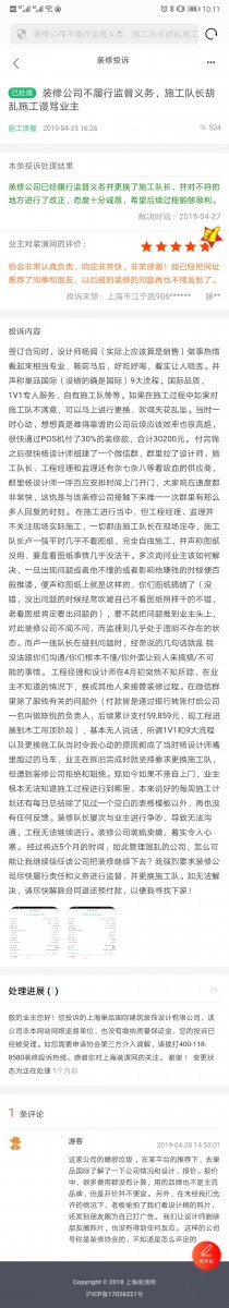 我于2019年4月25日于室內(nèi)裝潢協(xié)會(huì)網(wǎng)站進(jìn)行投訴,沒(méi)錯(cuò)在4月26日凌晨大概1點(diǎn)左右,工作某工作人員(之所以不寫(xiě)出他的名字,因?yàn)樗窃谡麄€(gè)巢品來(lái)說(shuō),算是一個(gè)比較靠譜的人也在后續(xù)一個(gè)月左右時(shí)間給我?guī)?lái)很大的幫助,我在下面簡(jiǎn)稱(chēng)為A)就在微信聯(lián)系了我,約我在當(dāng)日到工地去談?wù)劇?