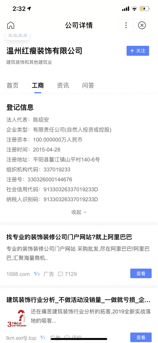| 注冊地址 | 室內(nèi)外裝飾工程設(shè)計(jì)、施工。(涉及資質(zhì)的憑資質(zhì)證書經(jīng)營。) | ||