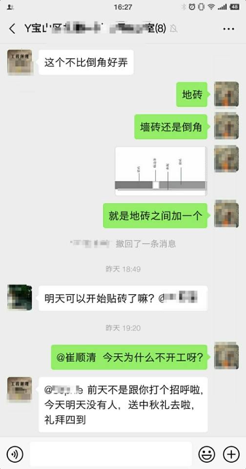 8月30日開(kāi)始做地坪,之后地坪保養(yǎng),直到9月6日瓦工進(jìn)場(chǎng),做了兩天,周末因?yàn)椴荒軘_民,停工一天,接著周一我去了工地,仍然不見(jiàn)施工,這就遇到我開(kāi)頭描述的情況,又停工了!理由是中秋節(jié)要去送禮,而且需要三天,這么高大上的理由真的是讓人無(wú)法拒絕,我除了目瞪口呆還能說(shuō)什么呢?由此直接導(dǎo)致此次投訴。