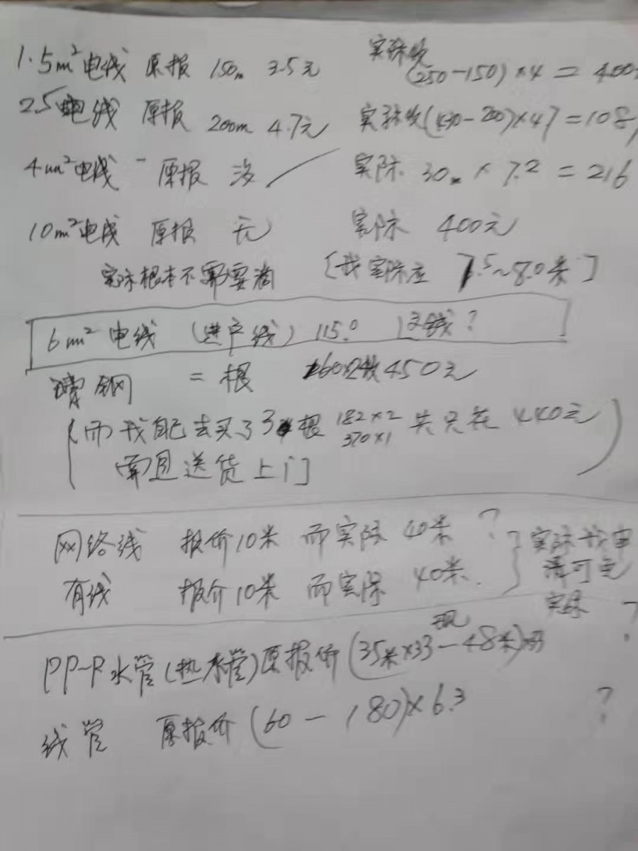 就拿買槽鋼舉例:張買了1米8二根花了450元,而途中為了趕時間我自己去買量是他的一倍多只花了440元,大家知道的這些都是送貨上門的,張說這個是他收取運費。還有在不到十平方廳下面他說總排了180根套管和700多米電線…