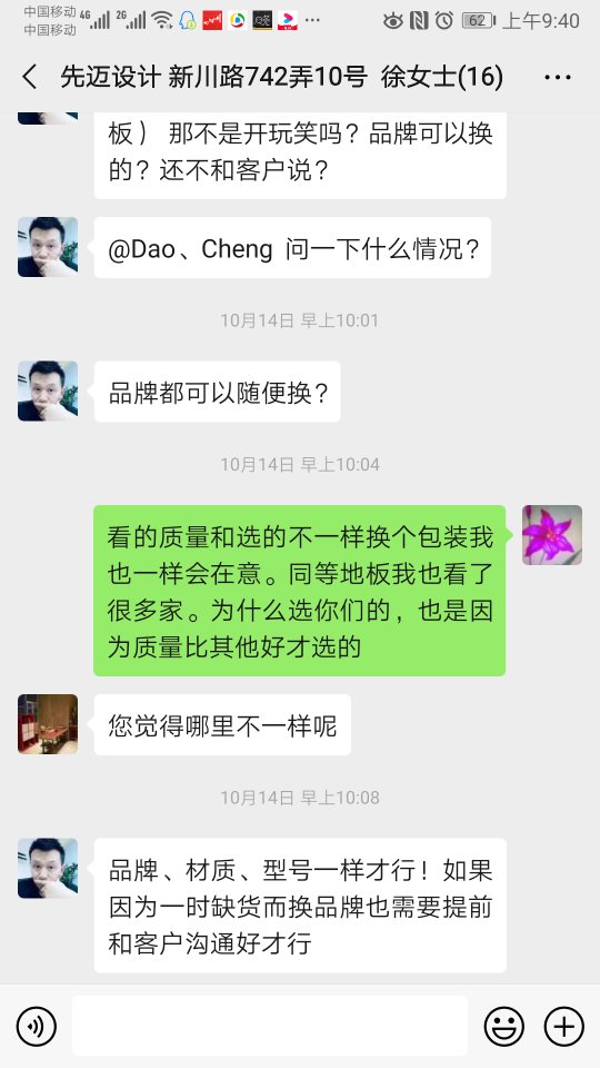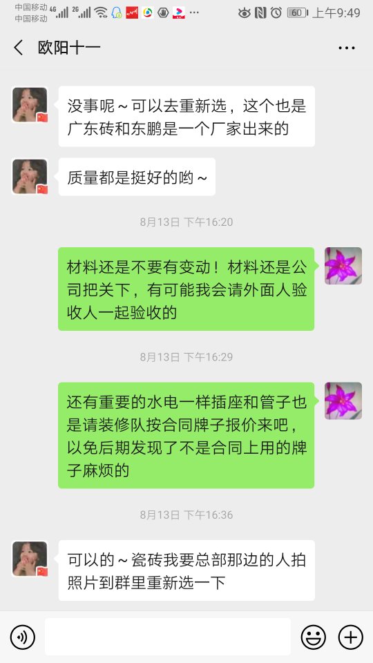 選擇全包就是為了省心省力的,先不說其中出現(xiàn)的一些其他問題。現(xiàn)在最頭疼問題就是材料屢次出問題。被及時發(fā)現(xiàn)的公司沒損失的公司解決,有損失的公司沉默處理,還停工!?。∥揖筒幻靼琢?個問題。1.裝修前合同里說的還有口頭對我說的施工會一直有監(jiān)工,我壓根兒就沒見。2.合同里也說了提供的材料會提前3天驗收,那我沒有看過材質(zhì)樣品的為什么不通知我驗收。這樣大家都不會有啥損失的!現(xiàn)在有損失的卻想著我來承擔(dān)!這個門套外面定制也需要25天,本已到完工期又耽誤工期。因為家有老人孩子要照顧的,我一直就催他們盡快,希望少點精力花在裝修上,但毫無作用。但起碼我家裝修質(zhì)量要保證?。≌嬲嫦MF單位幫幫忙,能早點幫忙解決,非常感謝?。?