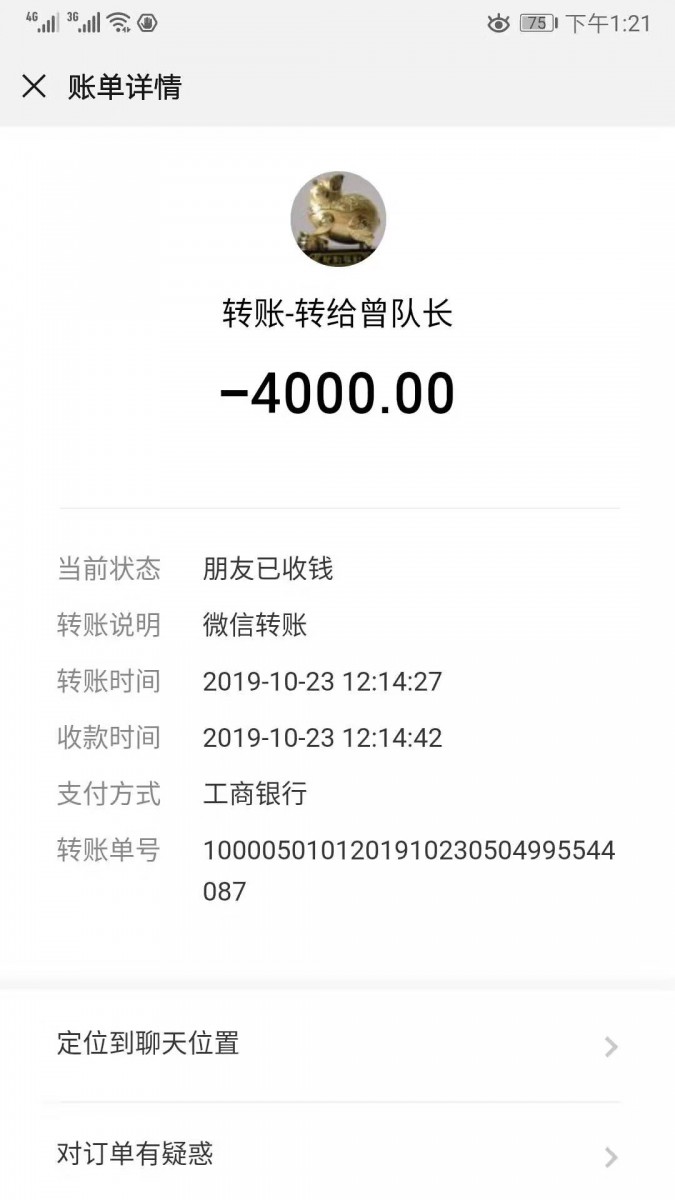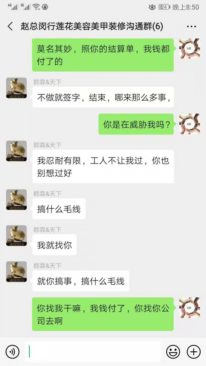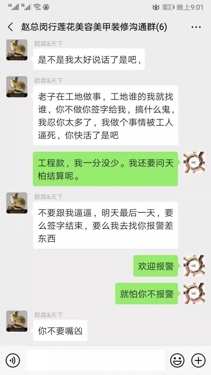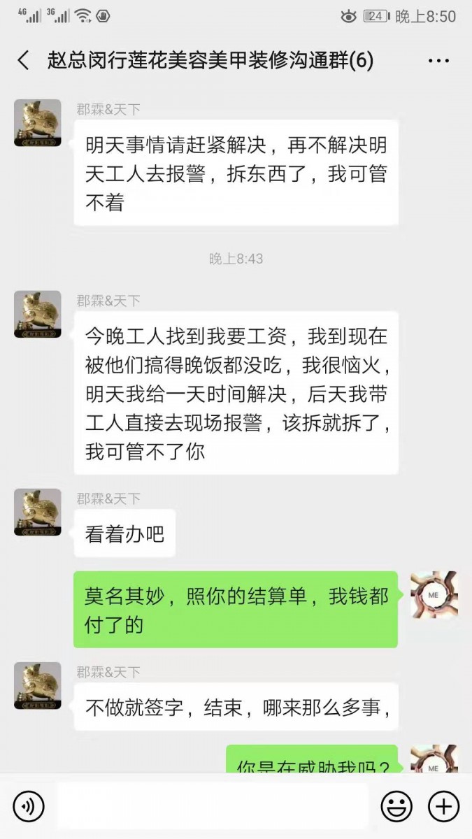 我表示不同意,我沒有違約,是天柏私自轉(zhuǎn)包違約在先,故要求退還除我認(rèn)可的施工費(fèi)用12000元外的10000元款項(xiàng)。此后,施工隊(duì)長曾某在微信群中聲稱因?yàn)槲也徽J(rèn)可他們的清算條件,導(dǎo)致他無法和公司結(jié)算工程款,要把我的店拆了?。。ù耸乱褕?bào)社區(qū)民警備案)。