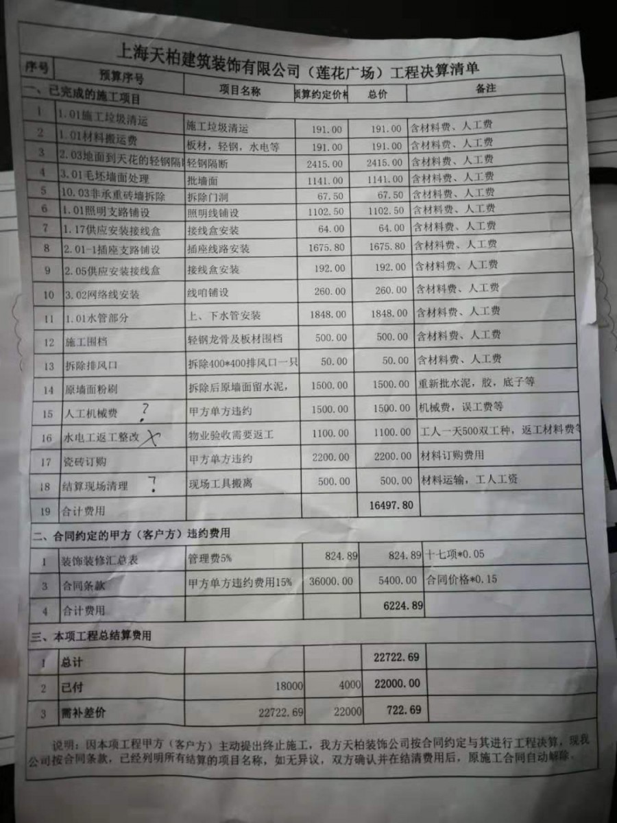 10月28日,水電工程布線完成,此時(shí)通過商場物業(yè)與我核對施工單位信息才發(fā)現(xiàn),原來施工單位并不是天柏公司,而是上海驍都建筑裝飾工程有限公司;我覺得天柏私自將工程轉(zhuǎn)包,沒有經(jīng)過我同意,實(shí)際施工進(jìn)度又非常緩慢。故提出解約,天柏公司出具了工程結(jié)算單,稱工程款和我的違金5400,總共加起來為22722.69元,我還要補(bǔ)給他們722.69元。