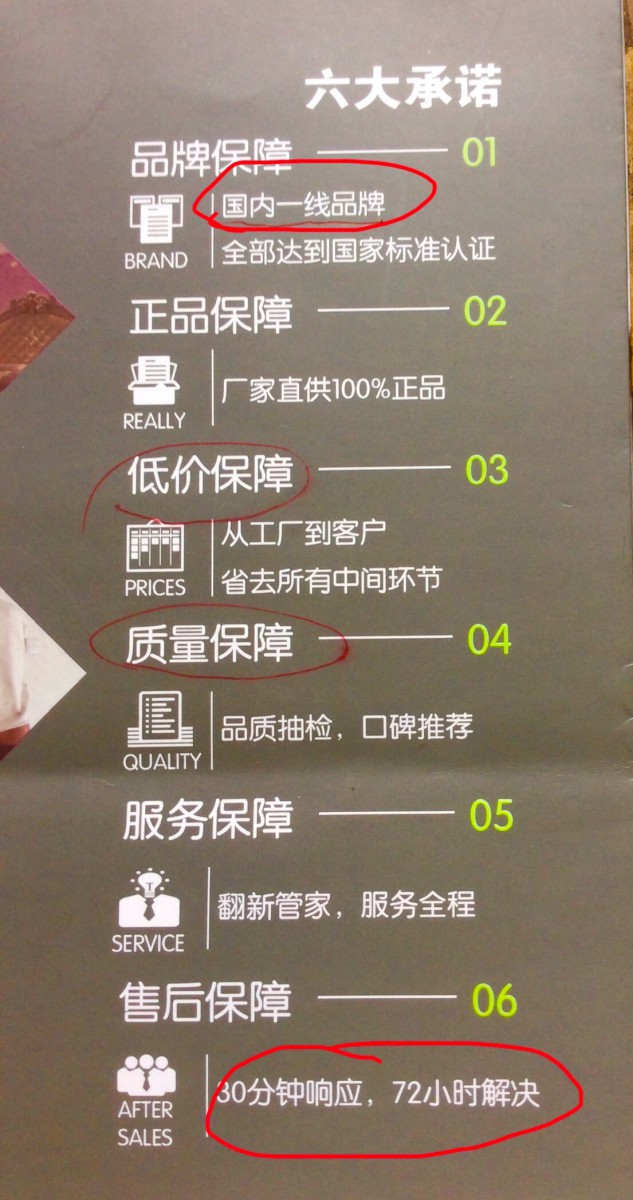 所謂“專業(yè)團(tuán)隊(duì)”在用料上竟以假亂真、以舊充新、偷工減料:公司承諾都用國(guó)內(nèi)一線品牌的材料;但地板被換了,墻磚不是一線品牌,有線、網(wǎng)線用我的舊線、還無(wú)法使用!他們把“全屋墻面翻新”,“撬掉舊地板,重新做水泥地坪”都省了,導(dǎo)致櫥柜安裝時(shí)因墻面的關(guān)系,無(wú)法安裝;在積滿垃圾、涂料和凹凸不平的舊地板上悄悄加鋪一層,被及時(shí)發(fā)現(xiàn)還強(qiáng)行鋪設(shè)。