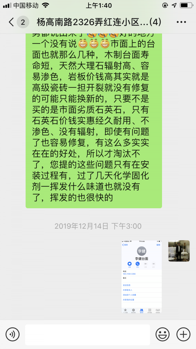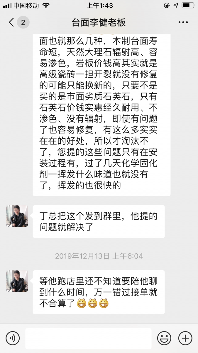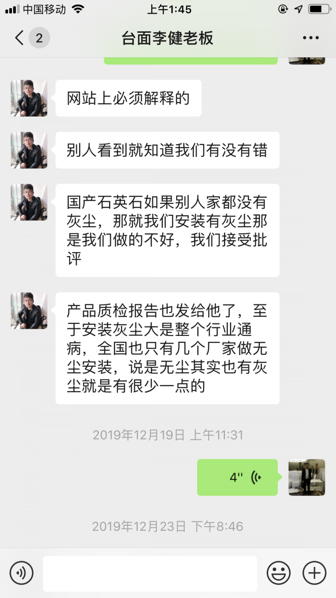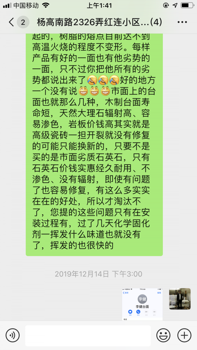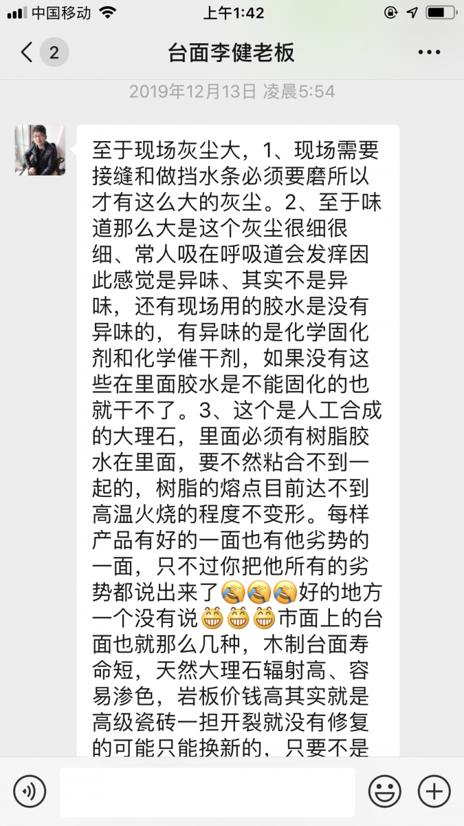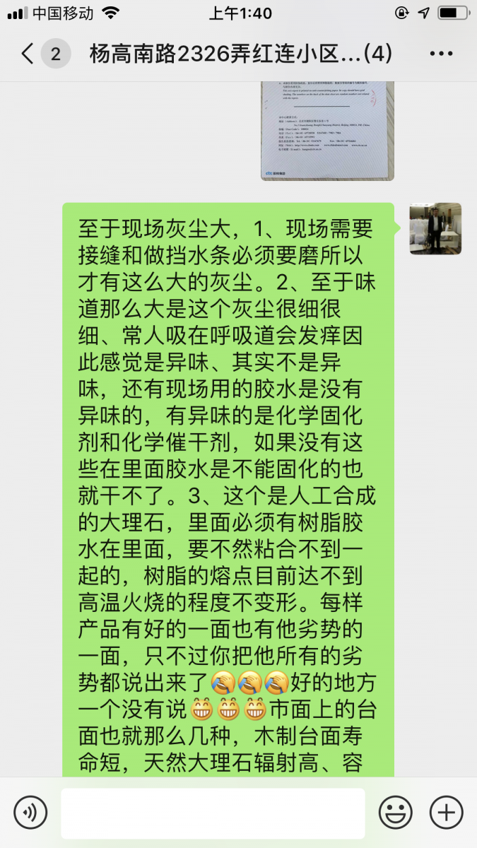 2、臺面楊灰有刺鼻氣味,雖不間斷通風,人在該空間頭暈、惡心,臺面完成1周后經(jīng)自測甲醛等中度超標.