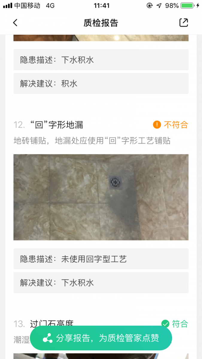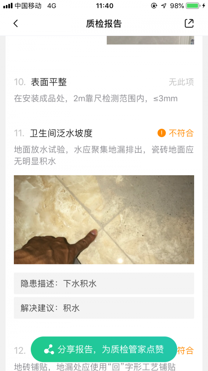 泥工進場,鋪磚空鼓,衛(wèi)生間泛水坡度不合格。馬桶安裝漏水造成新安裝三角水閥已生銹,地漏現(xiàn)在出水很難下.廚房的逆止閥施工丟失,給我一個塑料的替代沒有剛釘固定導致安裝煙管直接掉下不能用