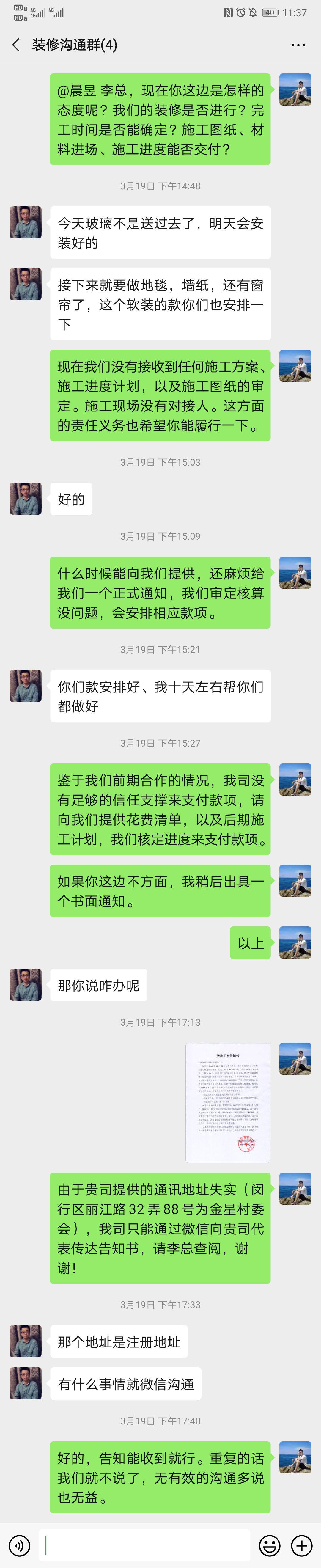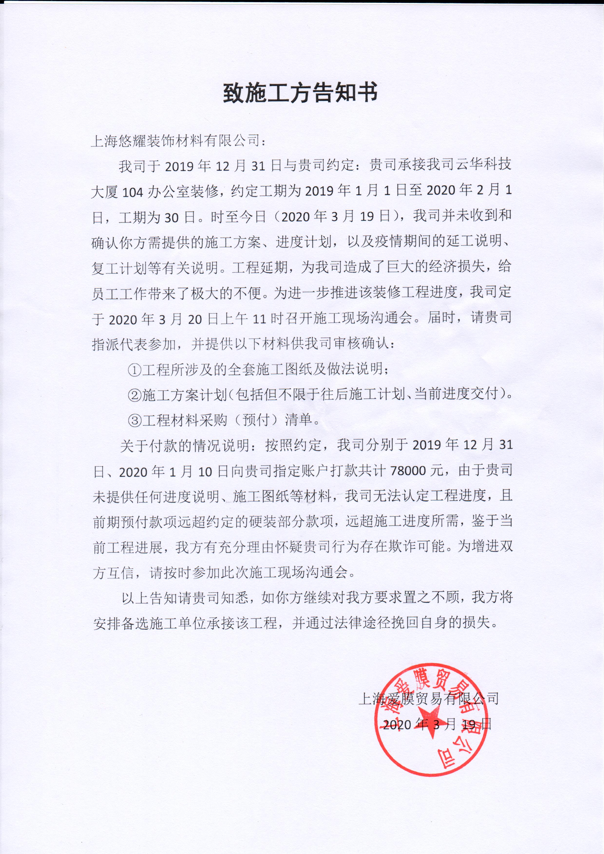 我司于2019年12月31日與上海悠耀裝飾材料有限公司(以下簡稱乙方)約定:乙方承接我司云華科技大廈104辦公室裝修,約定工期為2019年1月1日至2020年2月1日,工期為30日。時(shí)至今日(2020年3月24日),我司并未收到和確認(rèn)乙方需提供的施工方案、進(jìn)度計(jì)劃,以及疫情期間的延工說明、復(fù)工計(jì)劃等有關(guān)說明。上海復(fù)工后,我司多次聯(lián)系乙方協(xié)調(diào)解決,乙方拒接電話,并將之前建立的微信溝通群退出。無限期的拖延,為我司造成了巨大的經(jīng)濟(jì)損失,給員工工作帶來了極大的不便,希望通過協(xié)會領(lǐng)導(dǎo)協(xié)調(diào),讓我們能將工程完成,讓員工有地方安心上班,謝謝!