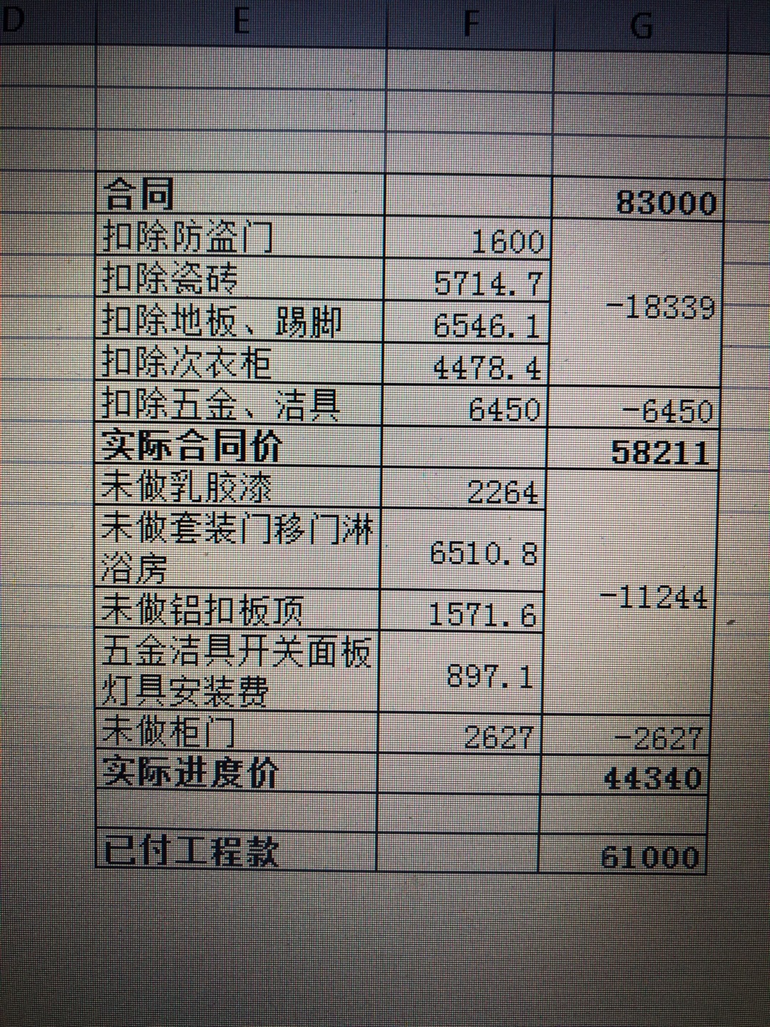 增項合同中瓷磚地板防盜門因為裝修公司無法提供預算內(nèi)價格指明的品牌,此部分只能業(yè)主自己采購。目前合同除去業(yè)主自己提供的,除去未施工的,實際進度款只有44340,目前已打款61000。