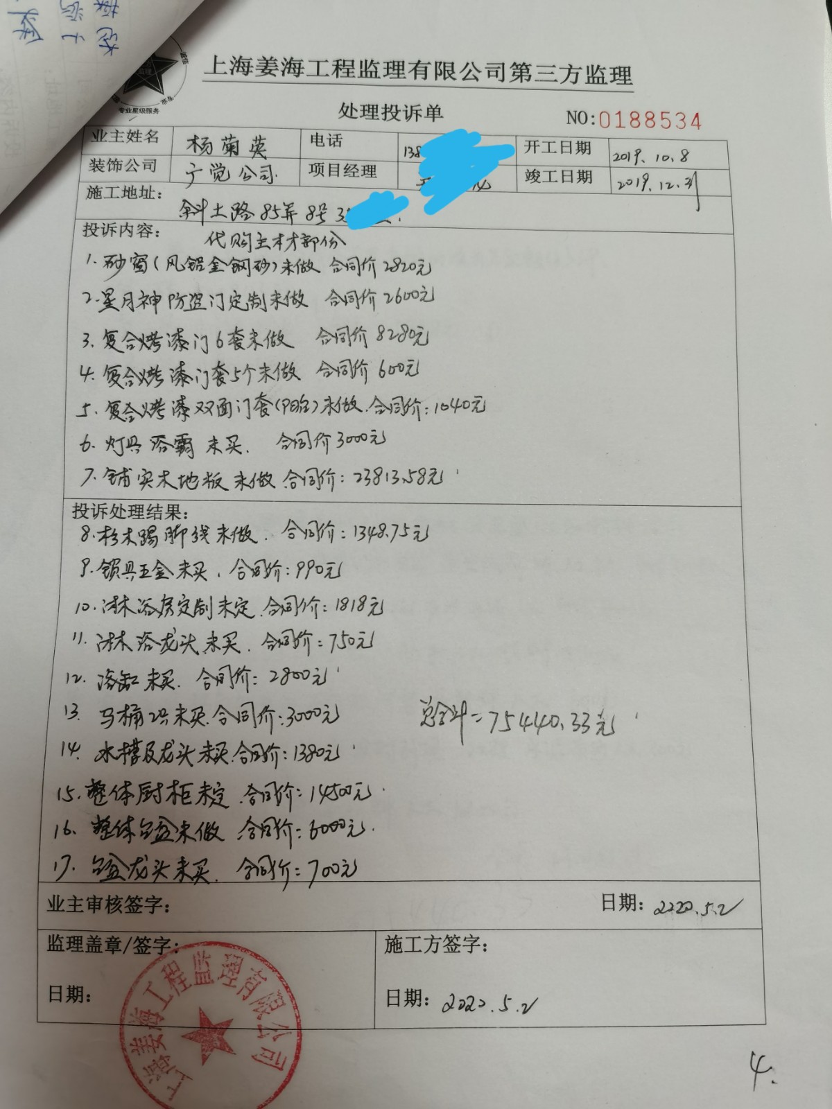 | 投訴類型 | 合同糾紛 | 投訴人 | 楊** | 被投訴單位 | 上海廣覺裝飾設計有限公司 |