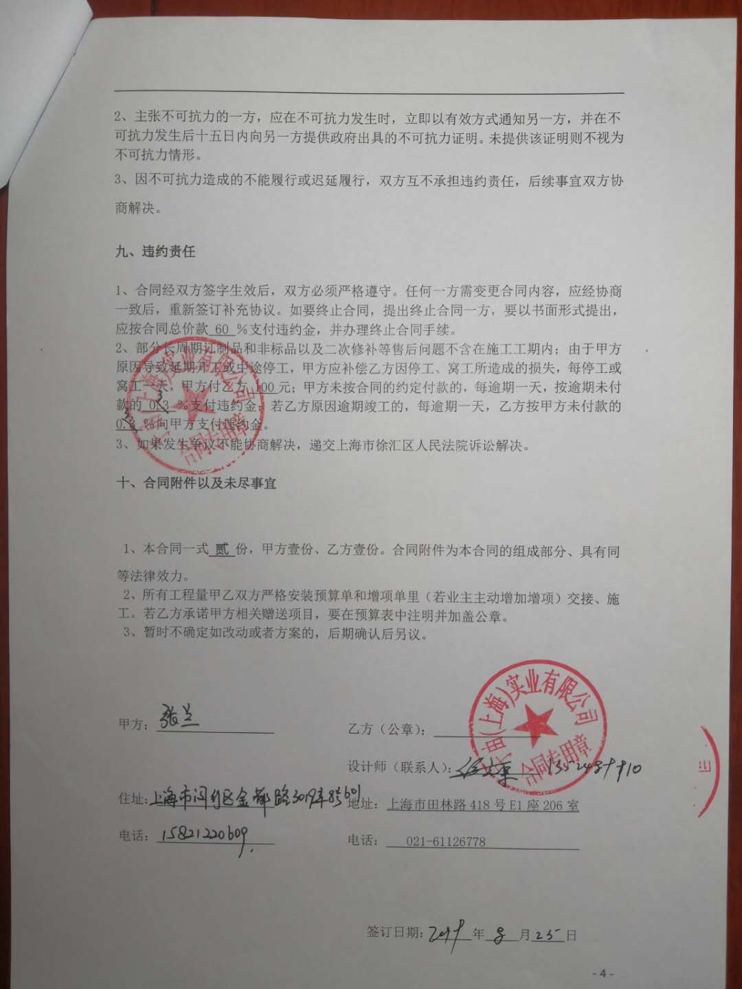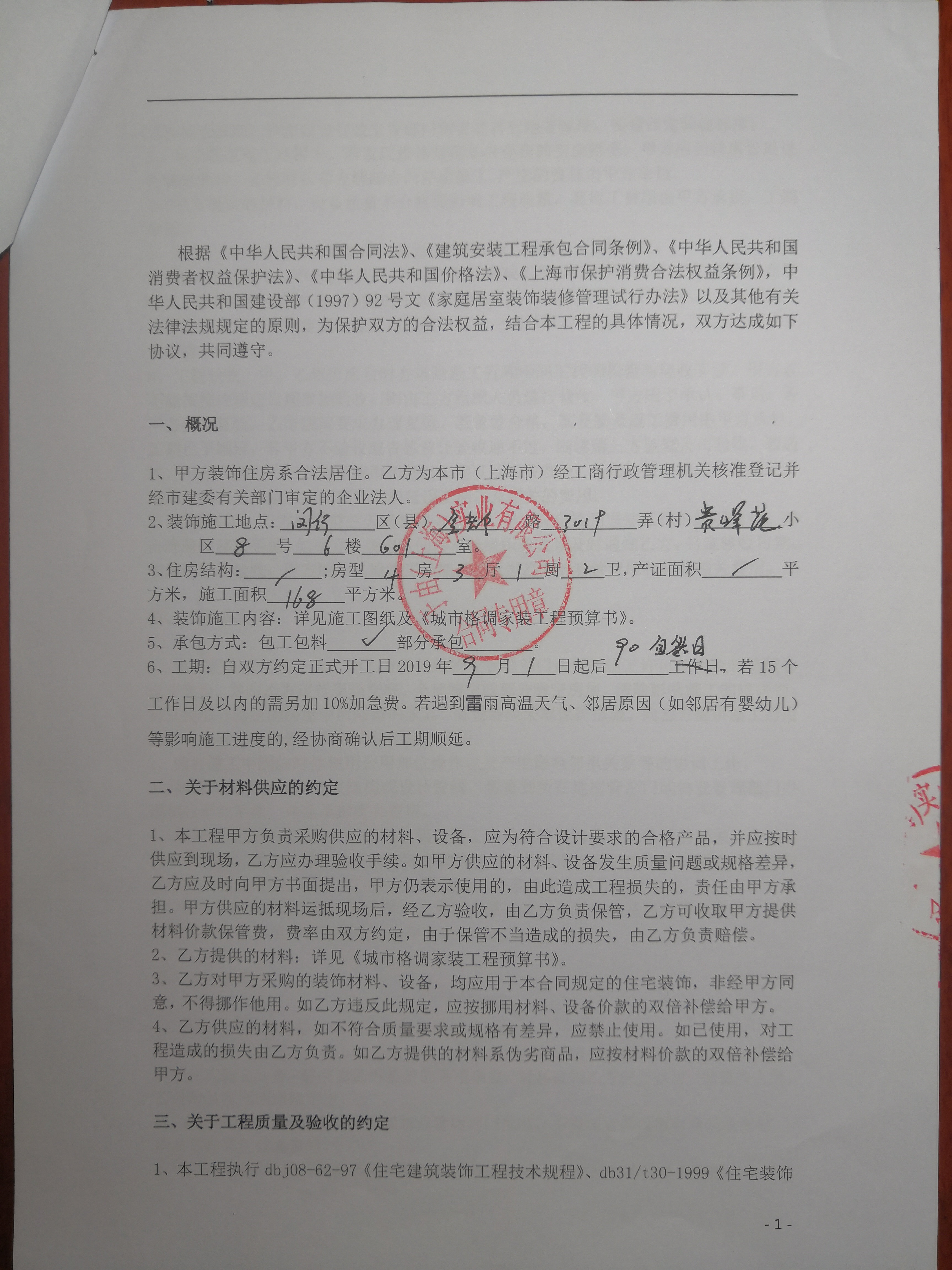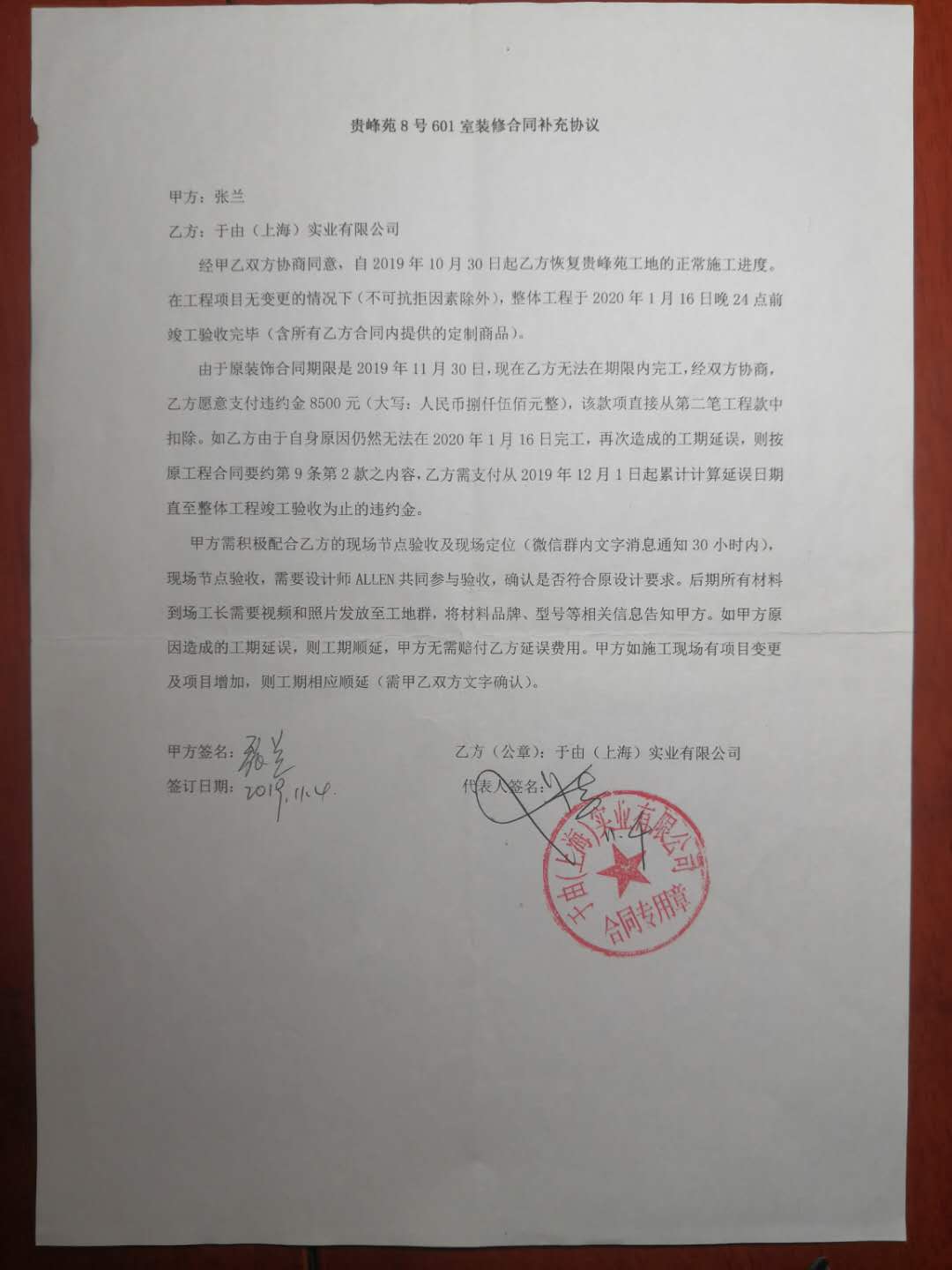 我們與城市格調(diào)(于由(上海)有限公司)2019年8月25日簽的合同,2019年9月1日開始施工,合同約定90個(gè)自然日完工,結(jié)果他們做不到,雙方協(xié)商后于2019年11月4日簽定補(bǔ)充協(xié)議,約定2020年1月16日完工驗(yàn)收。結(jié)果,2020年1月16日未完工(墻面乳膠漆,樓梯,部分柜子門板,部分踢腳線,淋浴房,浴室柜等都未完工,還有門存在質(zhì)量問題需要更換)。