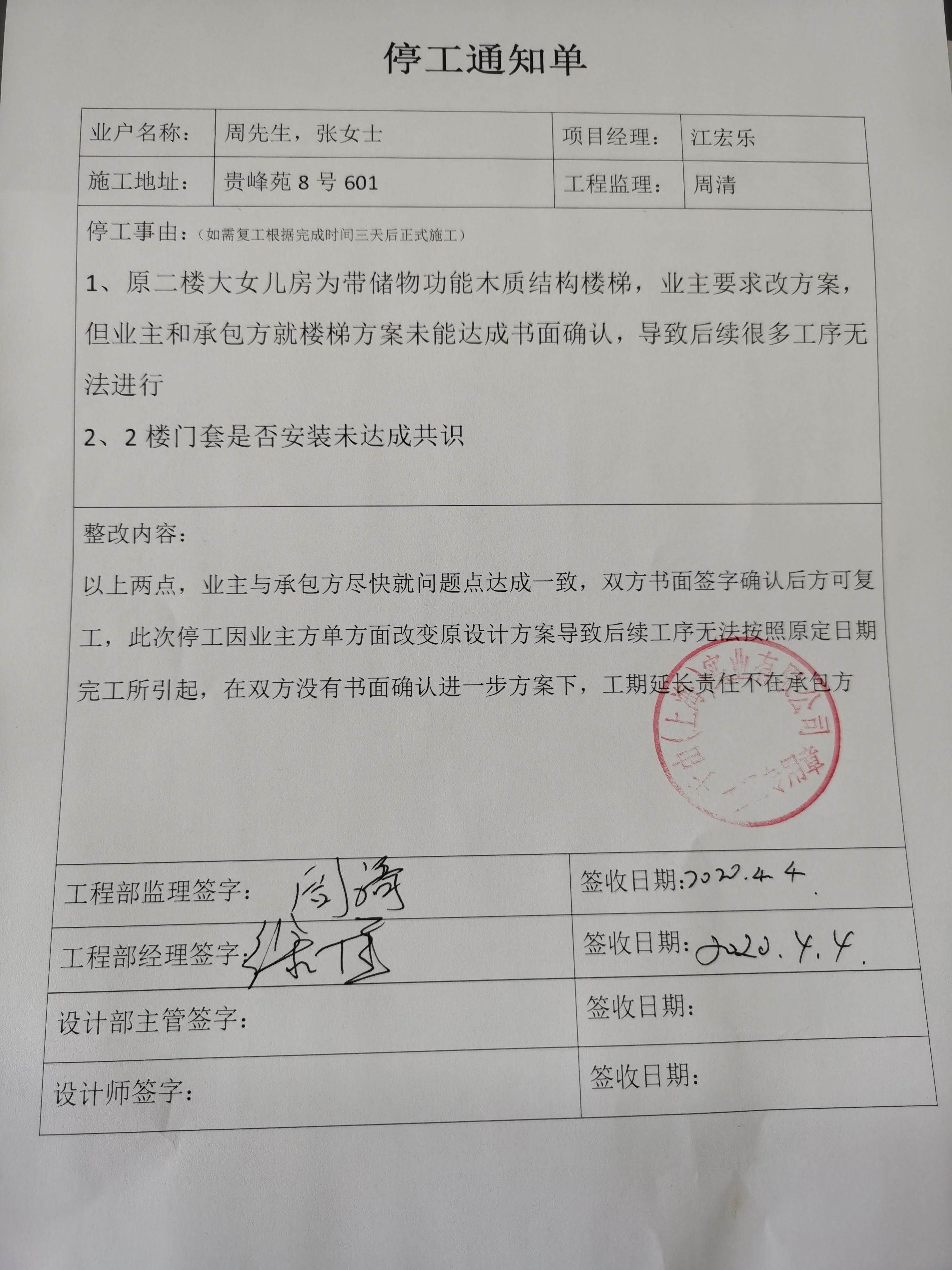 由于碰上疫情,一直拖到4月份,可以施工了,我們主動與裝修公司溝通,希望他們盡早安排人員施工,我們左等右等遲遲不開工。后來實(shí)在沒辦法,聯(lián)系到公司法人余紀(jì)剛過來協(xié)商,對方跟我們說因?yàn)槎ㄖ茦翘葸€沒有下單,門年前安裝有質(zhì)量問題,需要更換,這個(gè)周期也需要30天,這樣的話,我們房子的收尾至少還需要1個(gè)月的時(shí)間。我告訴他因?yàn)槲覀兪亲夥孔幼〉?,房租快到期了,本來?zhǔn)備年后就搬家的,所以好多東西都打包了,老人因?yàn)闆]地方住留在老家,二個(gè)孩子獨(dú)自待家中上網(wǎng)課,真的很著急,希望考慮到我們的實(shí)際情況,盡快給我們完工。并且我們該付的錢我們一分也不會少,但是也麻煩對方該付的責(zé)任也要承擔(dān)起來。結(jié)果城市格調(diào)(于由(上海)有限公司)余總說他安排人先把墻面粉刷好,樓梯先弄個(gè)什么東西先鋪上,不好的門先讓我們用著,后續(xù)再換上。先這樣解決我們的入住問題。至于違約金的賠償,他們就讓我們這樣算啦。我們不答應(yīng),結(jié)果第二天,他們就找個(gè)說不通的理由,單方面給我們開了個(gè)《停工通知》,就這樣把我的房子晾在這兒了。